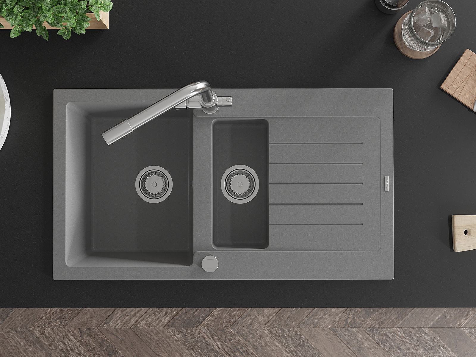 Den Ëmwäschbecken ass aus héichwäertege Granit gemaach. Et stellt eng elegant awer virun allem praktesch Ergänzung fir all Kichen duer, onofhängeg vun hirem Stil. Déi héich Qualitéit an Haltbarkeet vum Granit suergen fir méi järelaang Benotzung.