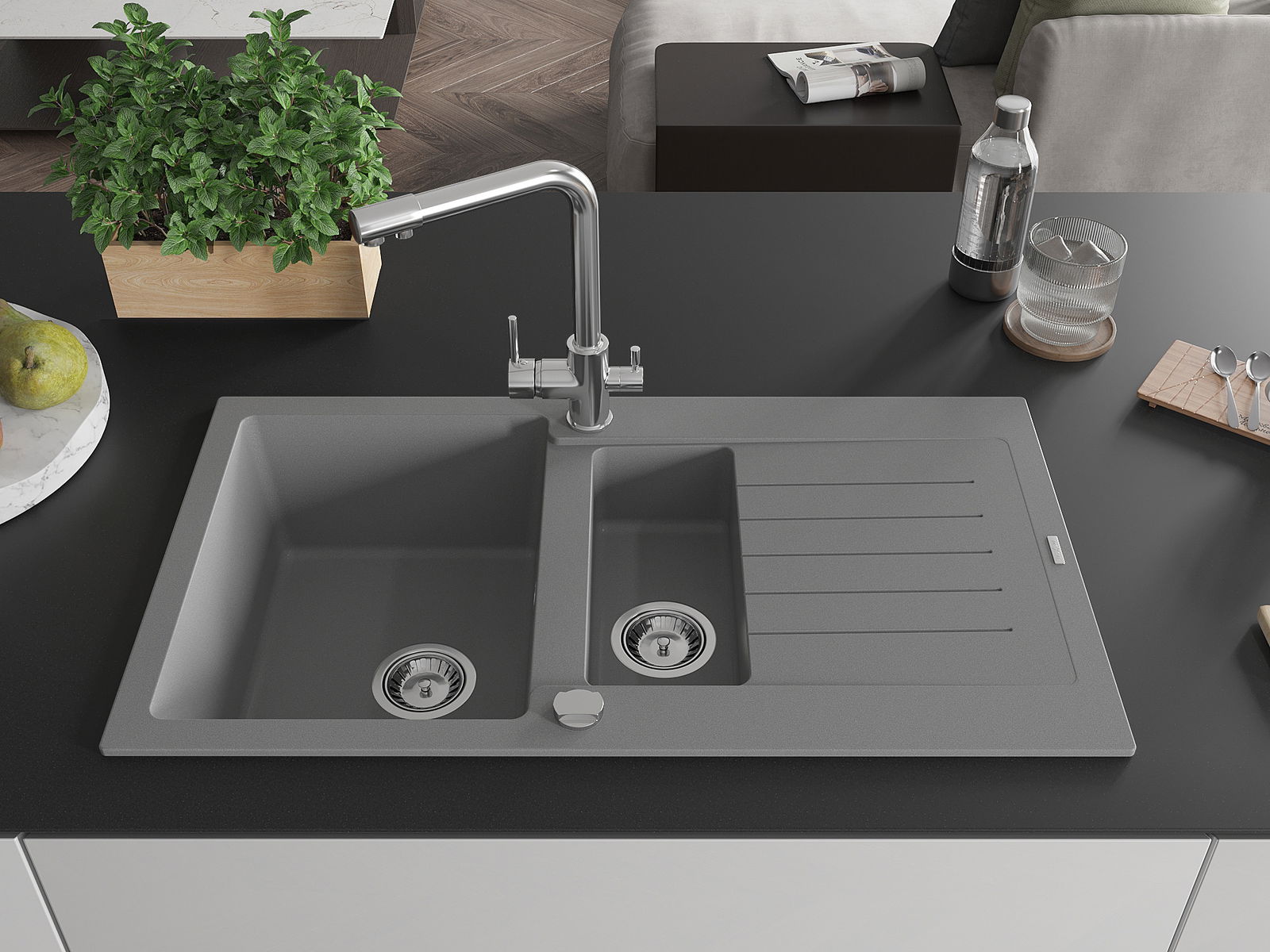 D'Uewerfläch vum Spullstee ass fleck- a verfärbungsresistent, wat se einfach ze botzen mécht an hir Faarf iwwer eng laang Zäit vum Gebrauch behalen léisst. Esthetesch an praktesch Ergänzung fir all Kichen.