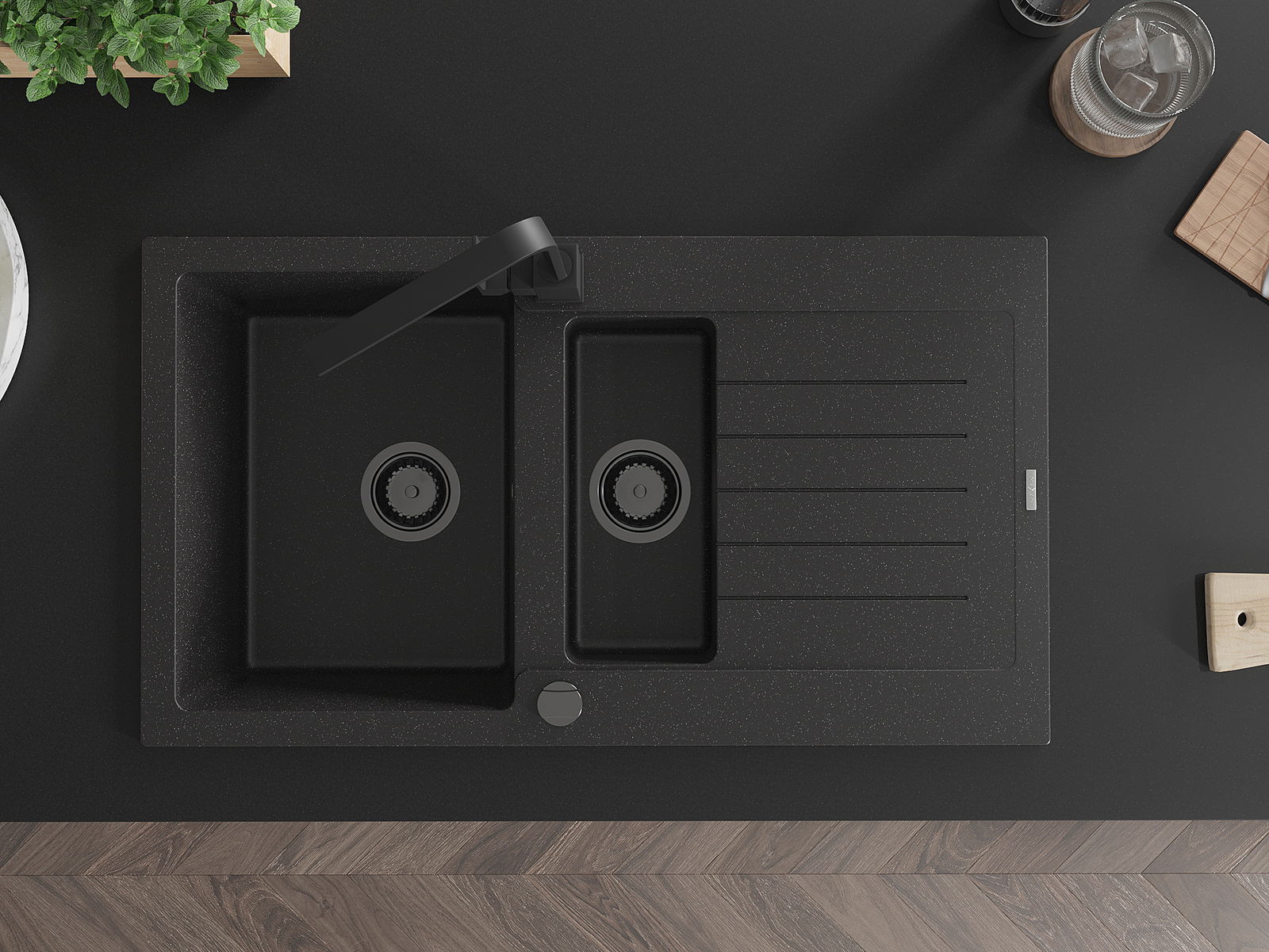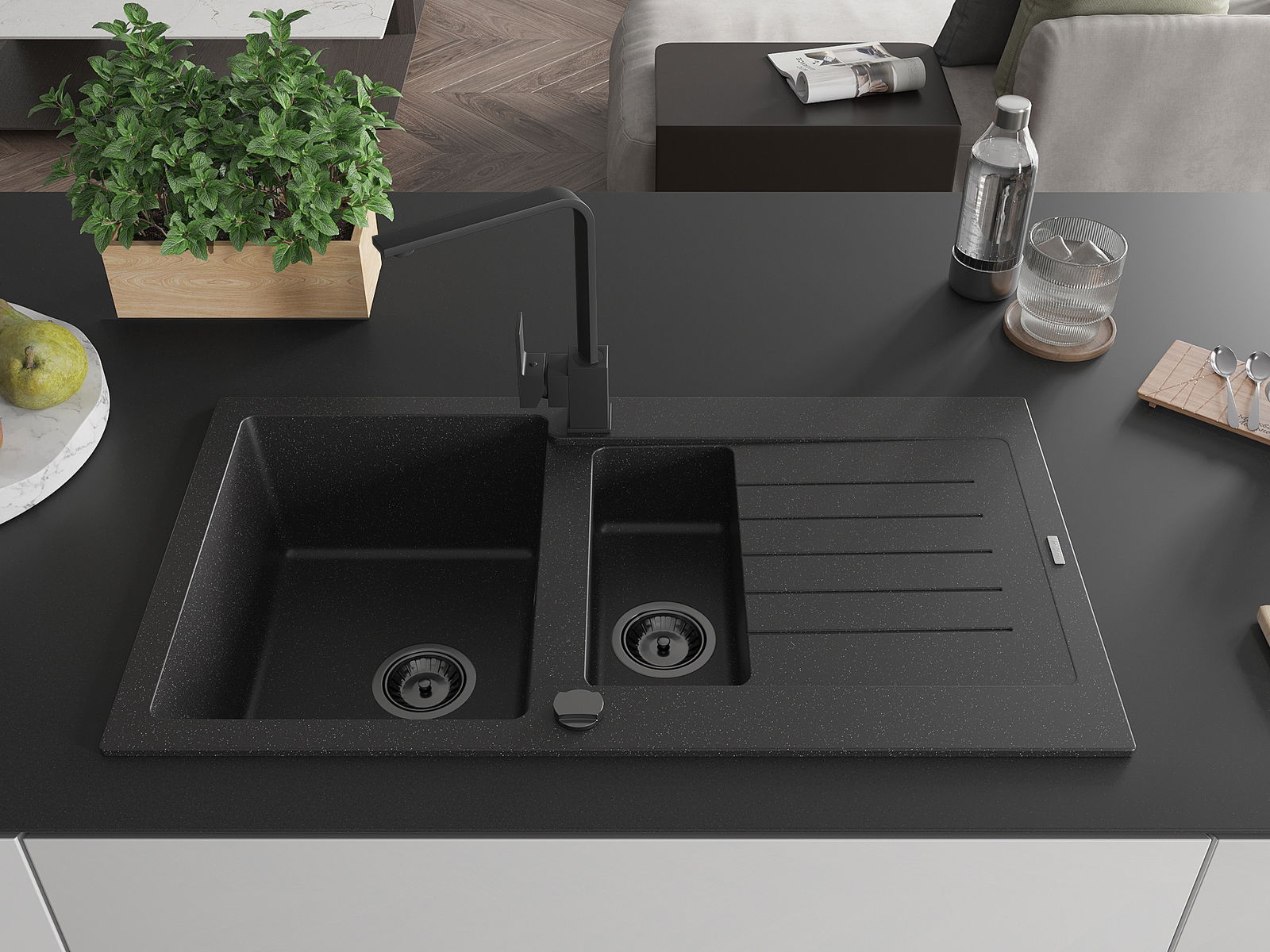 Mexen Matias Granitëspüllsteen mat 1,5 Kummer mat Oflaaf an Kichekran Rita, schwaarz/sëlwerg - 6502-73-670300-70-B