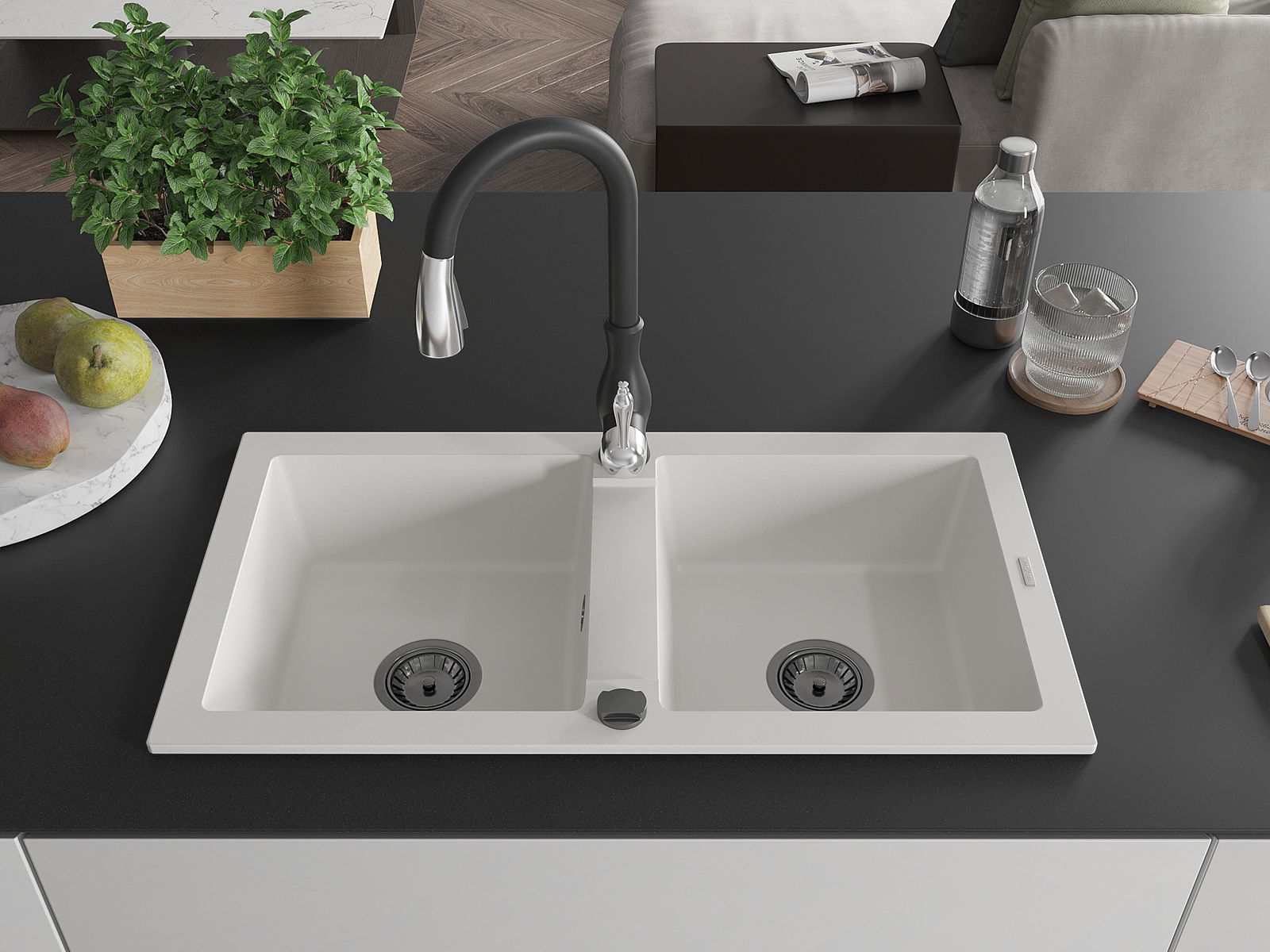 De plazspuersparenden Syphon ass entworf ginn, fir d'Fläch ënner dem Spull maximal ze reduzéieren. Dank senger kompakter Konstruktioun erlaabt et e fräien Opstelle vu Gidderkuerf oder anere Accessoiren am Schaf. Dëst ass eng praktesch an modern Léisung, ideal fir kleng Kichen oder Interieuren, wou all Zentimeter Plaz zielt.
