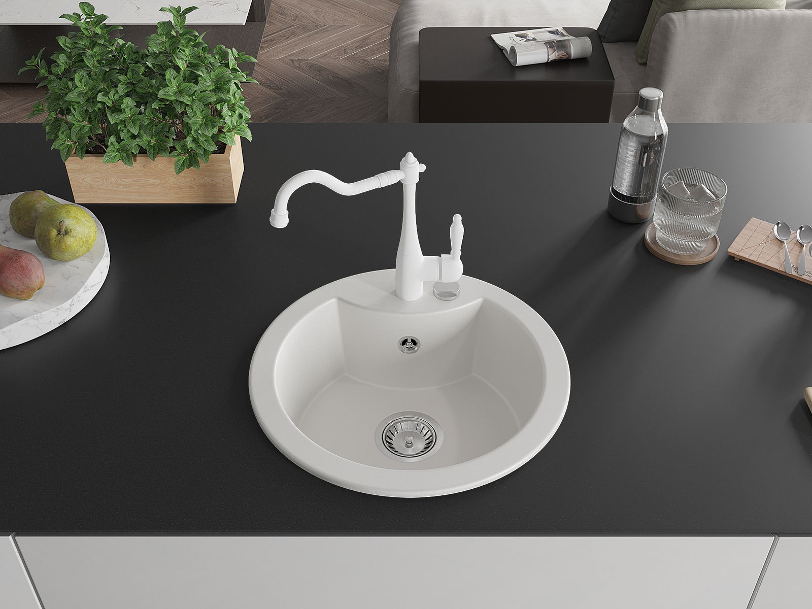 Den Ëmwäschbecken ass aus héichwäertege Granit gemaach. Et stellt eng elegant awer virun allem praktesch Ergänzung fir all Kichen duer, onofhängeg vun hirem Stil. Déi héich Qualitéit an Haltbarkeet vum Granit suergen fir méi järelaang Benotzung.