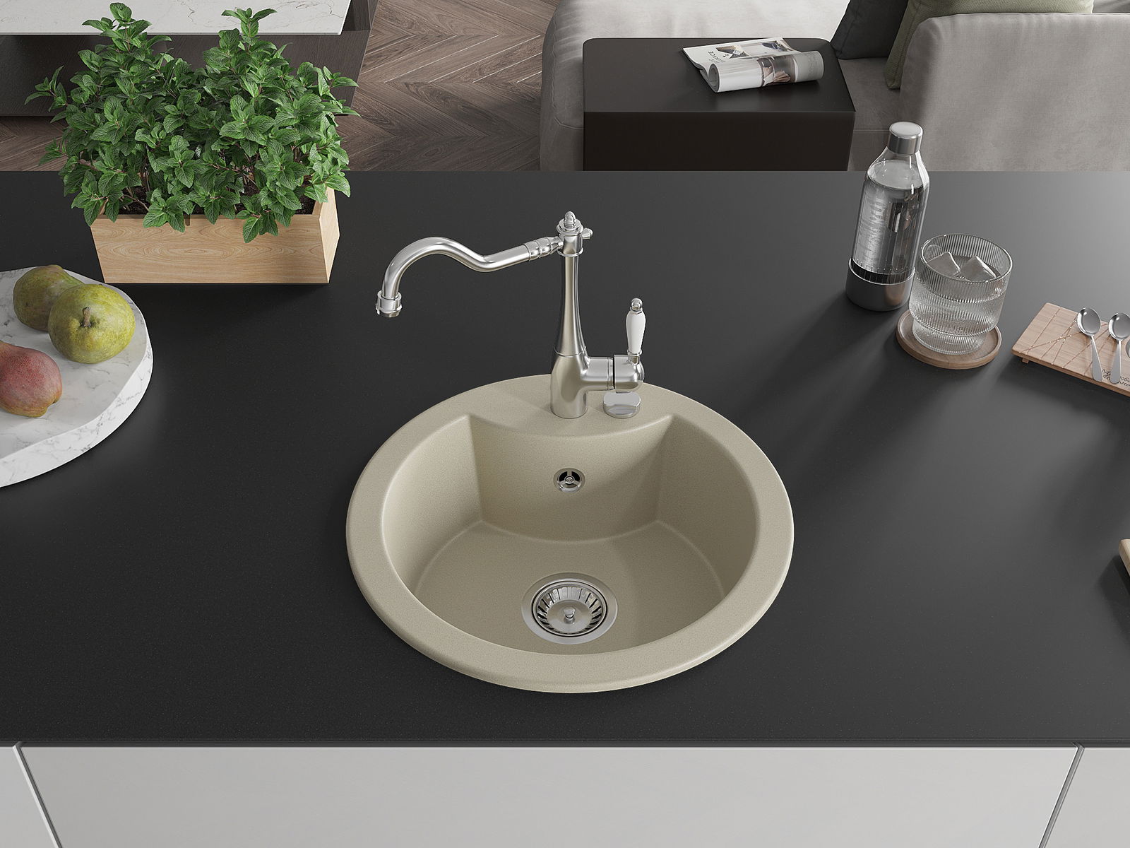 Den Ëmwäschbecken ass aus héichwäertege Granit gemaach. Et stellt eng elegant awer virun allem praktesch Ergänzung fir all Kichen duer, onofhängeg vun hirem Stil. Déi héich Qualitéit an Haltbarkeet vum Granit suergen fir méi järelaang Benotzung.