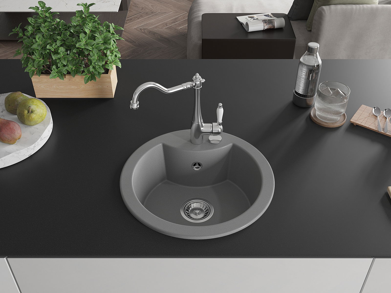Den Ëmwäschbecken ass aus héichwäertege Granit gemaach. Et stellt eng elegant awer virun allem praktesch Ergänzung fir all Kichen duer, onofhängeg vun hirem Stil. Déi héich Qualitéit an Haltbarkeet vum Granit suergen fir méi järelaang Benotzung.