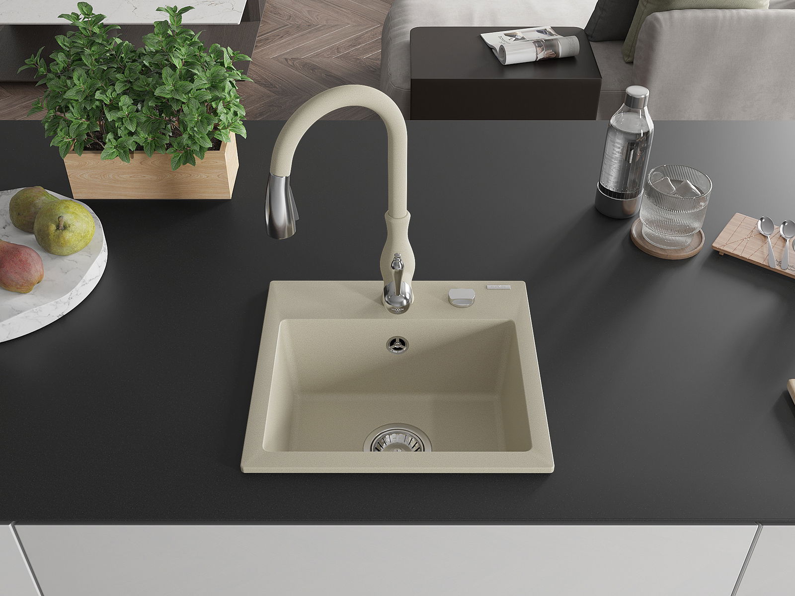 Den Ëmwäschbecken ass aus héichwäertege Granit gemaach. Et stellt eng elegant awer virun allem praktesch Ergänzung fir all Kichen duer, onofhängeg vun hirem Stil. Déi héich Qualitéit an Haltbarkeet vum Granit suergen fir méi järelaang Benotzung.