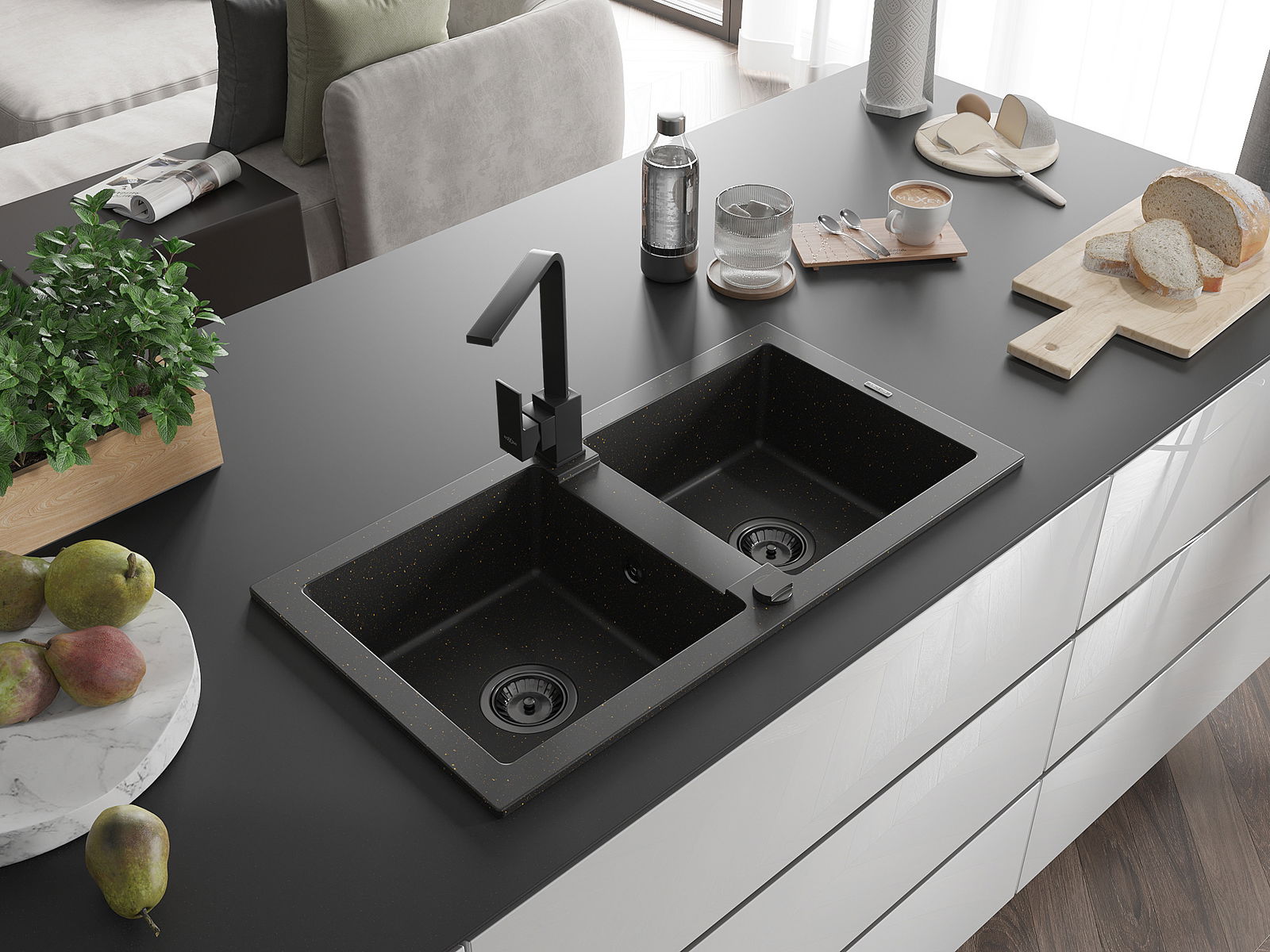 Den Ëmwäschbecken ass aus héichwäertege Granit gemaach. Et stellt eng elegant awer virun allem praktesch Ergänzung fir all Kichen duer, onofhängeg vun hirem Stil. Déi héich Qualitéit an Haltbarkeet vum Granit suergen fir méi järelaang Benotzung.