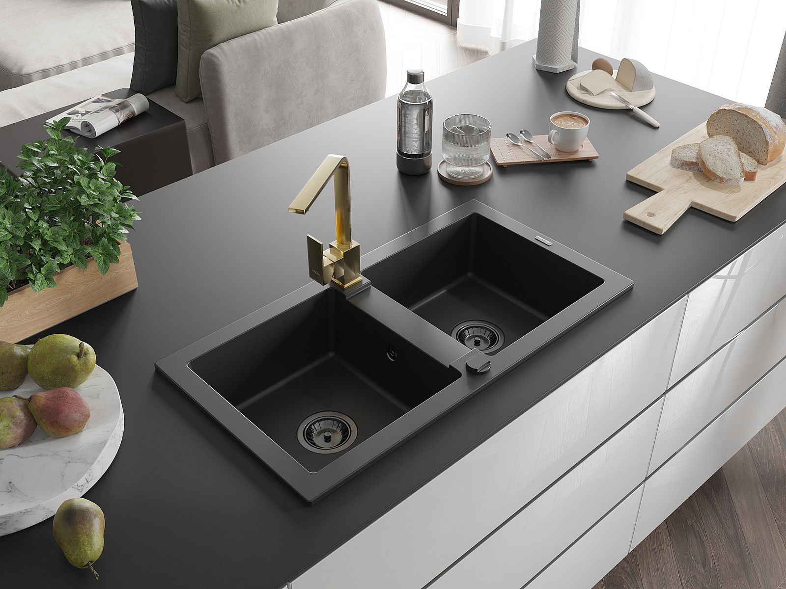 De plazspuersparenden Syphon ass entworf ginn, fir d'Fläch ënner dem Spull maximal ze reduzéieren. Dank senger kompakter Konstruktioun erlaabt et e fräien Opstelle vu Gidderkuerf oder anere Accessoiren am Schaf. Dëst ass eng praktesch an modern Léisung, ideal fir kleng Kichen oder Interieuren, wou all Zentimeter Plaz zielt.