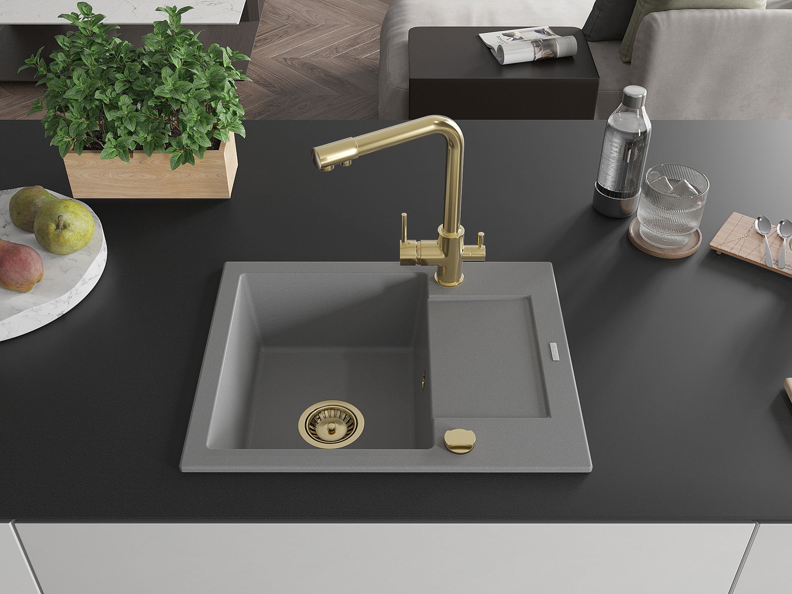 Den Ëmwäschbecken ass aus héichwäertege Granit gemaach. Et stellt eng elegant awer virun allem praktesch Ergänzung fir all Kichen duer, onofhängeg vun hirem Stil. Déi héich Qualitéit an Haltbarkeet vum Granit suergen fir méi järelaang Benotzung.