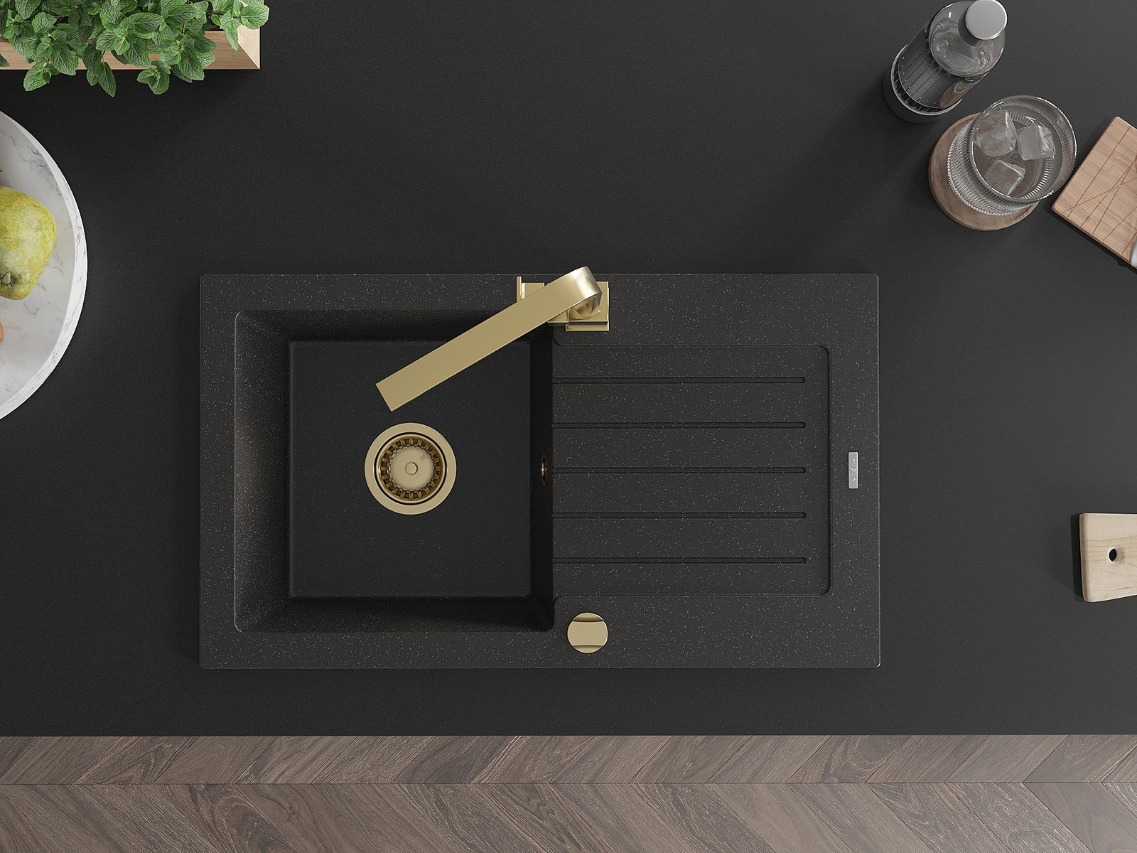 Mexen Pablo Granit Kichenbëcken, 1-Kummer mat Ofdrëpsberäich an Rita Kichenkrunn, schwaarz/sëlwermetallesch