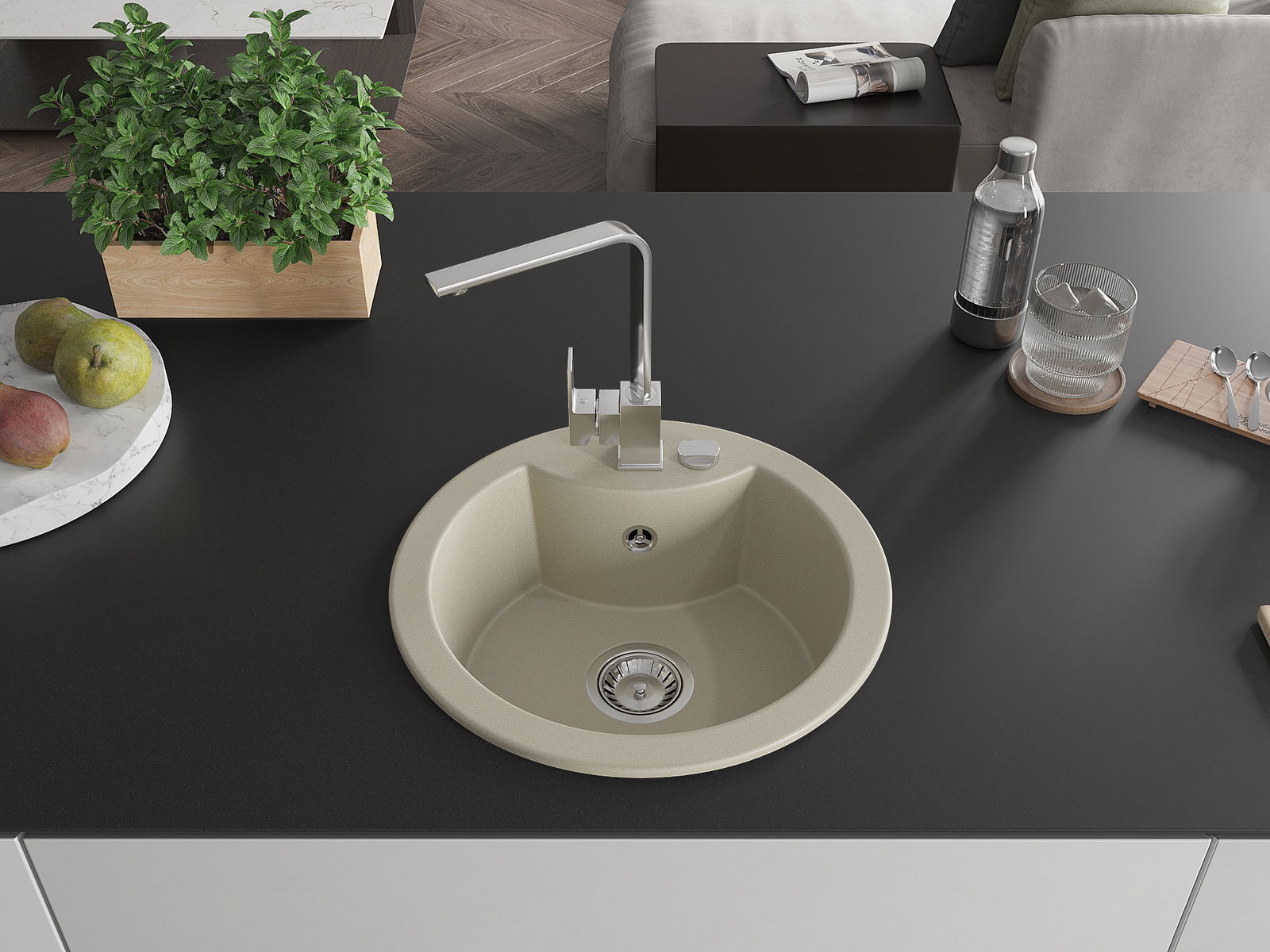 Den Ëmwäschbecken ass aus héichwäertege Granit gemaach. Et stellt eng elegant awer virun allem praktesch Ergänzung fir all Kichen duer, onofhängeg vun hirem Stil. Déi héich Qualitéit an Haltbarkeet vum Granit suergen fir méi järelaang Benotzung.