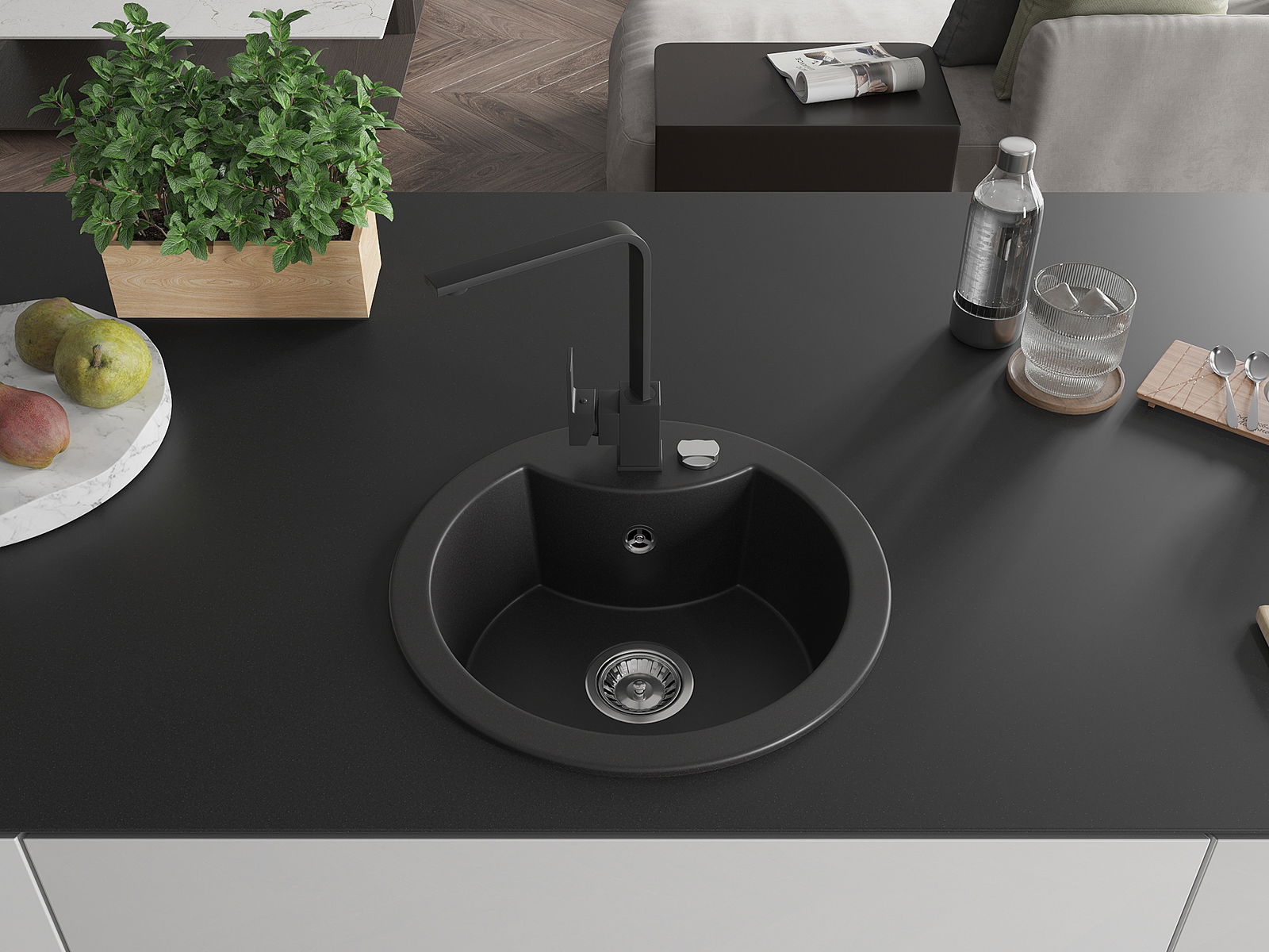 Den Ëmwäschbecken ass aus héichwäertege Granit gemaach. Et stellt eng elegant awer virun allem praktesch Ergänzung fir all Kichen duer, onofhängeg vun hirem Stil. Déi héich Qualitéit an Haltbarkeet vum Granit suergen fir méi järelaang Benotzung.