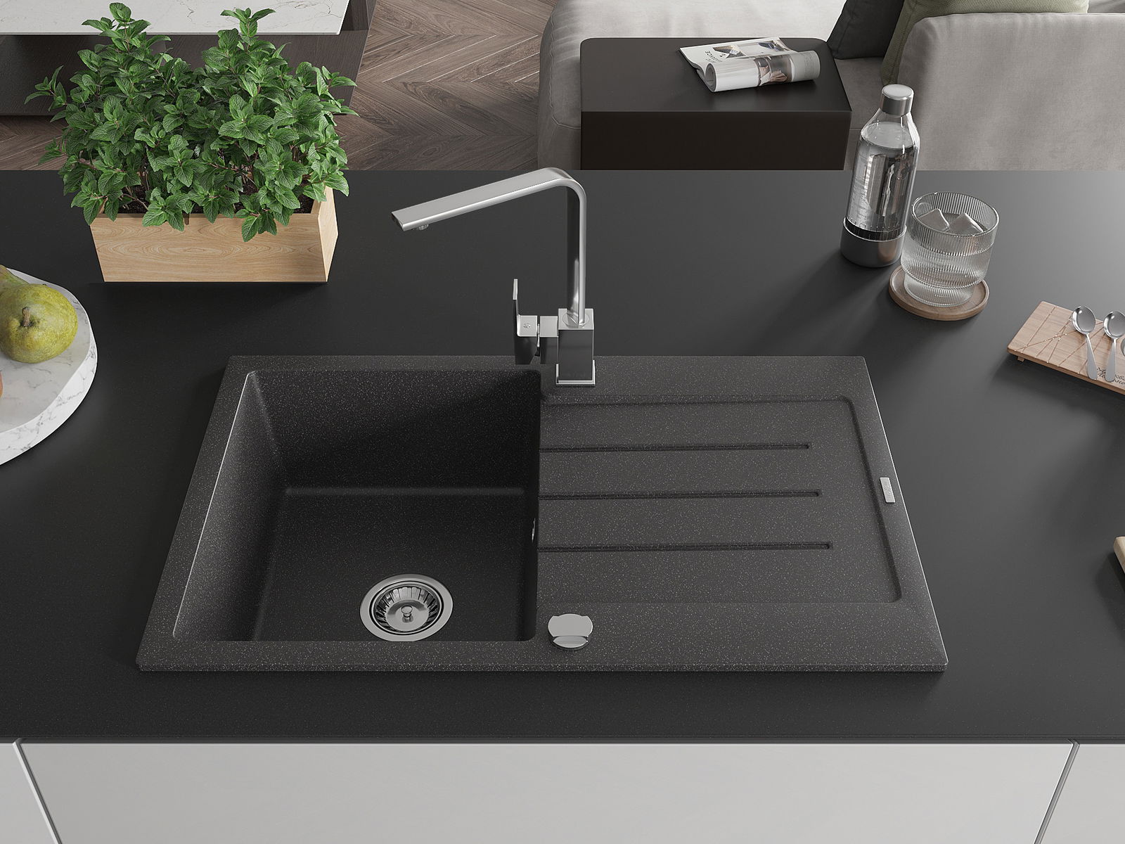 Mexen Bruno Granit Spullstännen mat 1 Kammer mat Ofträglech an Kichenkrunn Rita, schwaarz gespréichelt - 6513-76-670300-00