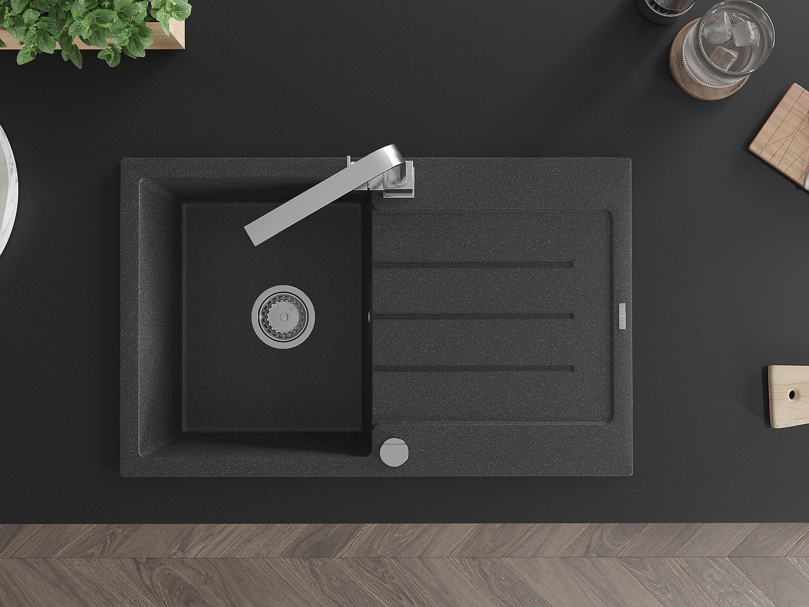 D'Uewerfläch vum Spullbecken ass ganz gutt gehärt, et ass aussergewéinlech resistent géint mechanesch Schied a Kratzer. De bestännege Materialausféierung erlaabt Iech d'gutt Ausgesinn vum Spullbecken fir vill Joeren ze genéissen.