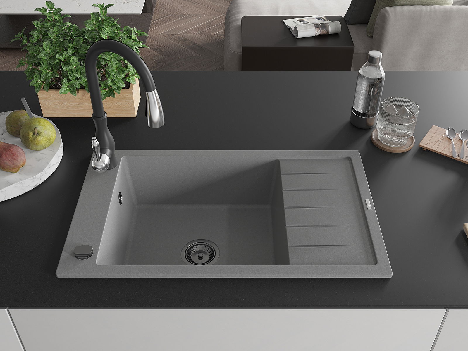 Den Ëmwäschbecken ass aus héichwäertege Granit gemaach. Et stellt eng elegant awer virun allem praktesch Ergänzung fir all Kichen duer, onofhängeg vun hirem Stil. Déi héich Qualitéit an Haltbarkeet vum Granit suergen fir méi järelaang Benotzung.