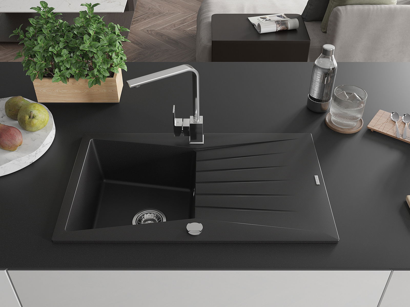 Mexen Cesar Granit-Ëvier mat 1-Kummer mat Drainage an der Kichenbatterie Rita, schwaarz - 6514-77-670300-00