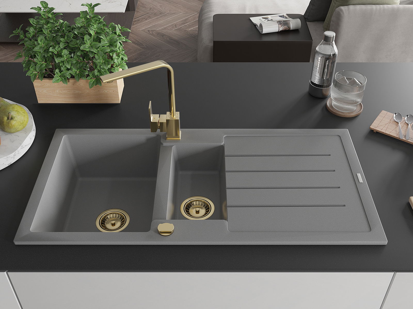 Den Ëmwäschbecken ass aus héichwäertege Granit gemaach. Et stellt eng elegant awer virun allem praktesch Ergänzung fir all Kichen duer, onofhängeg vun hirem Stil. Déi héich Qualitéit an Haltbarkeet vum Granit suergen fir méi järelaang Benotzung.
