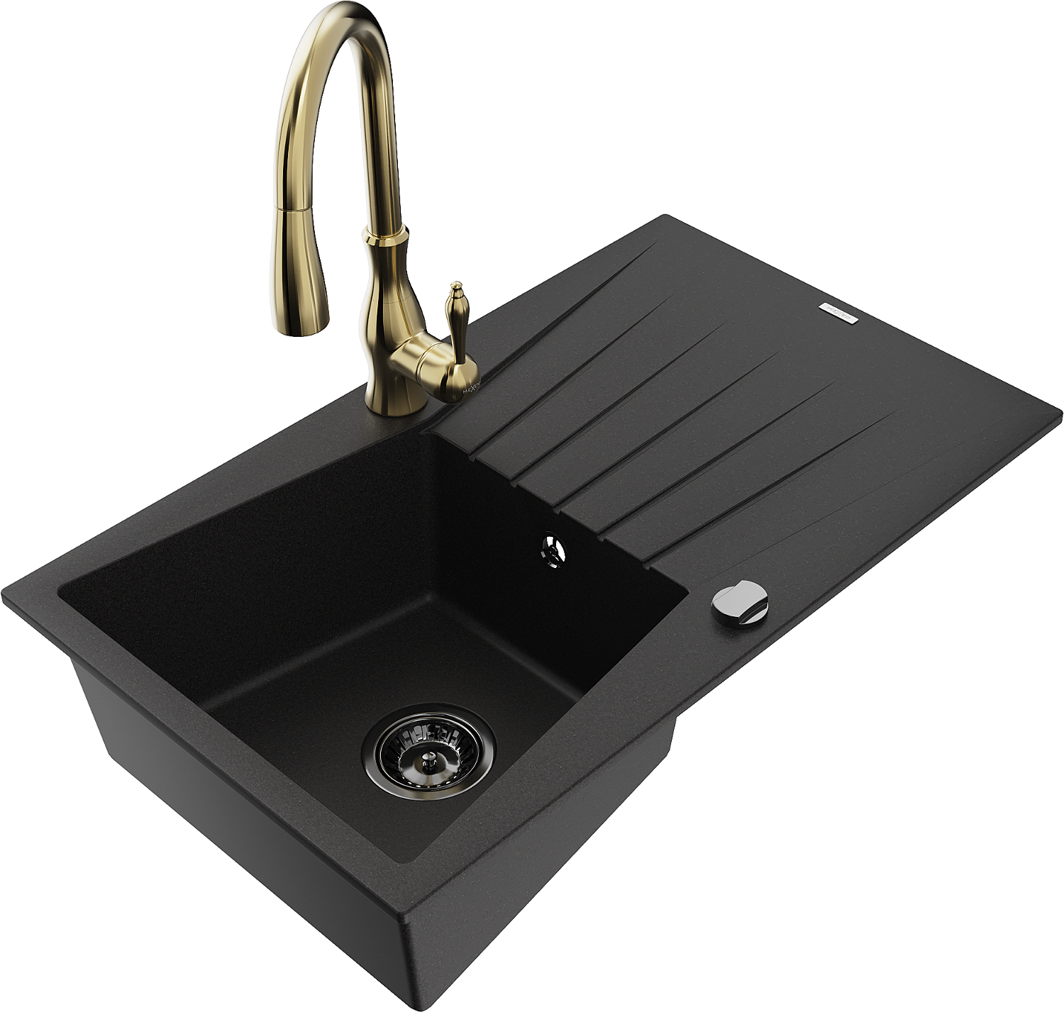 Mexen Cesar Granitten Ëmwäschbecken mat 1 Schoss a Spullfläch a Kichekran Savita, schwaarz - 6514-77-672601-50-B