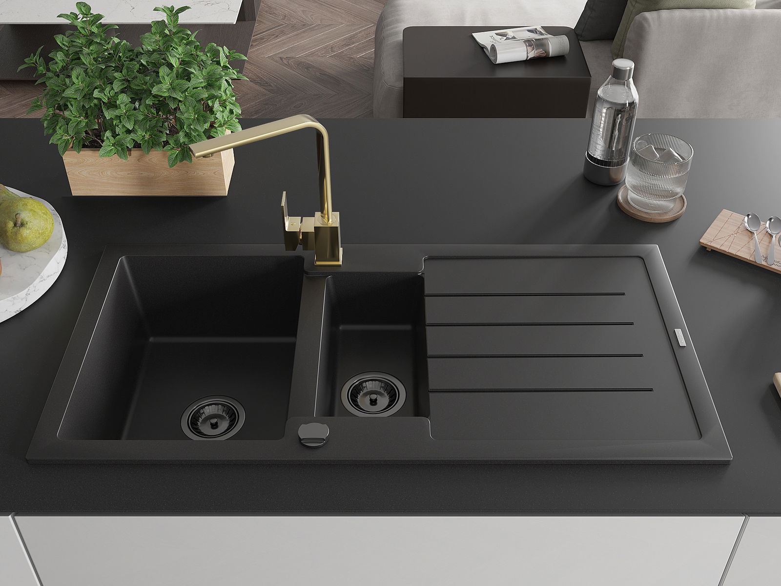 Den Spullsteen huet 2 virberäitet Lächer mat engem Duerchmiesser vun 35 mm, déi selbststänneg ausgeschloen kënne ginn. Se kënne fir d'Montage vun engem Flëssegkeetsspender benotzt ginn, deen d'Präsenz vu Plastikfläschen an der Kichen eliminéiert an hir en elegant Finish gëtt.