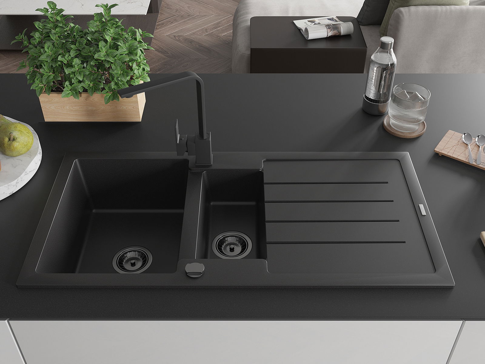 Mexen Andres Granitspullt 1,5-Chamber mat Drëpsplack an Kichebatterie Rita, schwaarz - 6515-77-670300-70-B