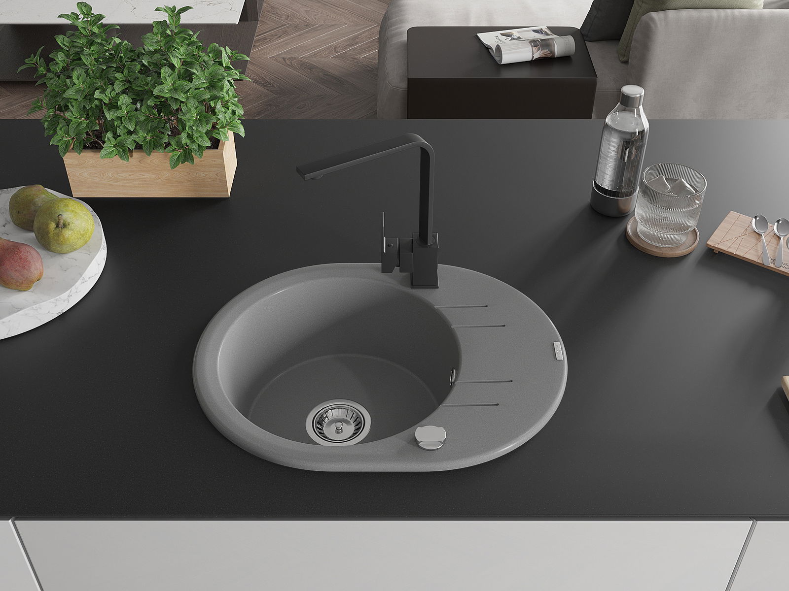 Den Ëmwäschbecken ass aus héichwäertege Granit gemaach. Et stellt eng elegant awer virun allem praktesch Ergänzung fir all Kichen duer, onofhängeg vun hirem Stil. Déi héich Qualitéit an Haltbarkeet vum Granit suergen fir méi järelaang Benotzung.