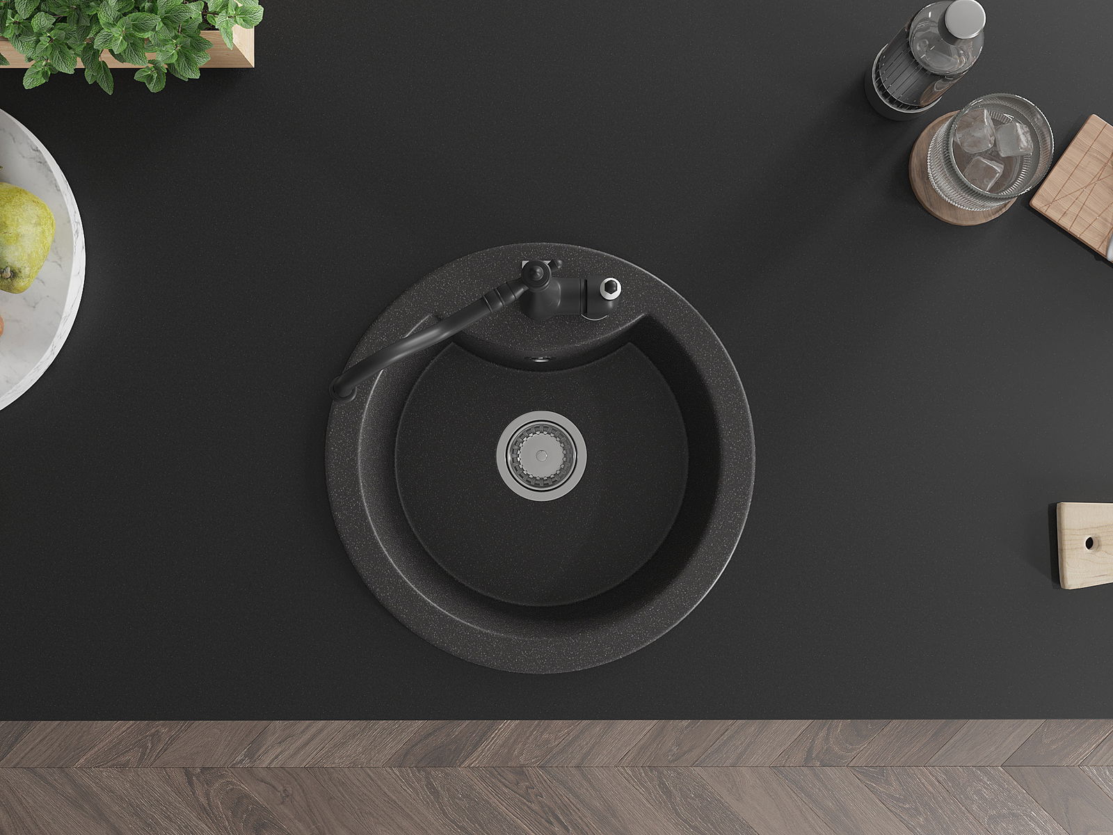 Den Ëmwäschbecken ass aus héichwäertege Granit gemaach. Et stellt eng elegant awer virun allem praktesch Ergänzung fir all Kichen duer, onofhängeg vun hirem Stil. Déi héich Qualitéit an Haltbarkeet vum Granit suergen fir méi järelaang Benotzung.