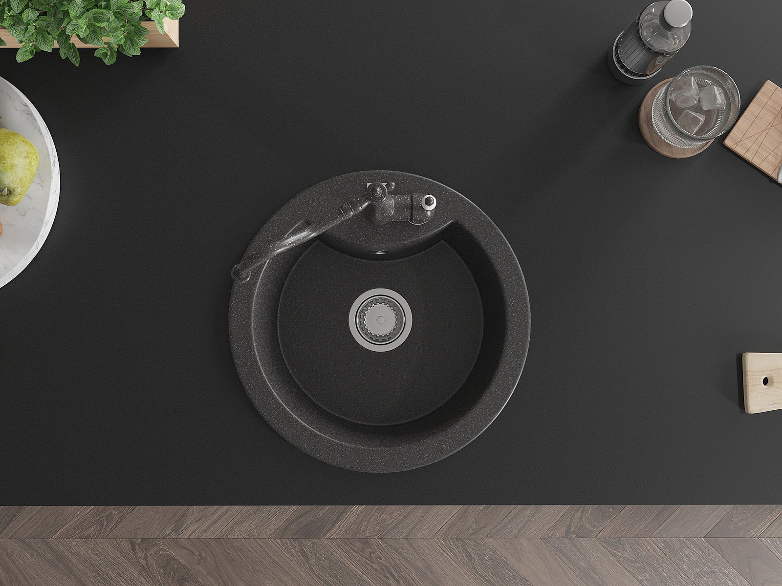 Den Ëmwäschbecken ass aus héichwäertege Granit gemaach. Et stellt eng elegant awer virun allem praktesch Ergänzung fir all Kichen duer, onofhängeg vun hirem Stil. Déi héich Qualitéit an Haltbarkeet vum Granit suergen fir méi järelaang Benotzung.