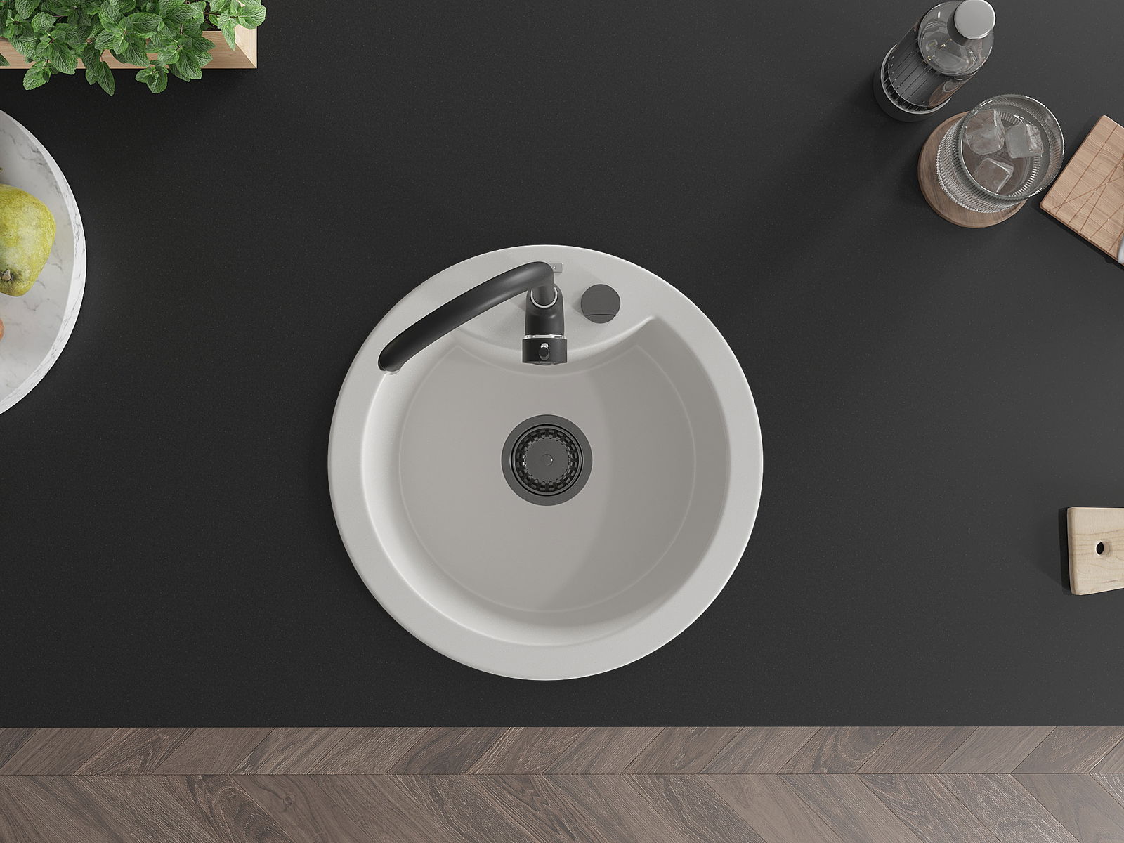 Den Ëmwäschbecken ass aus héichwäertege Granit gemaach. Et stellt eng elegant awer virun allem praktesch Ergänzung fir all Kichen duer, onofhängeg vun hirem Stil. Déi héich Qualitéit an Haltbarkeet vum Granit suergen fir méi järelaang Benotzung.