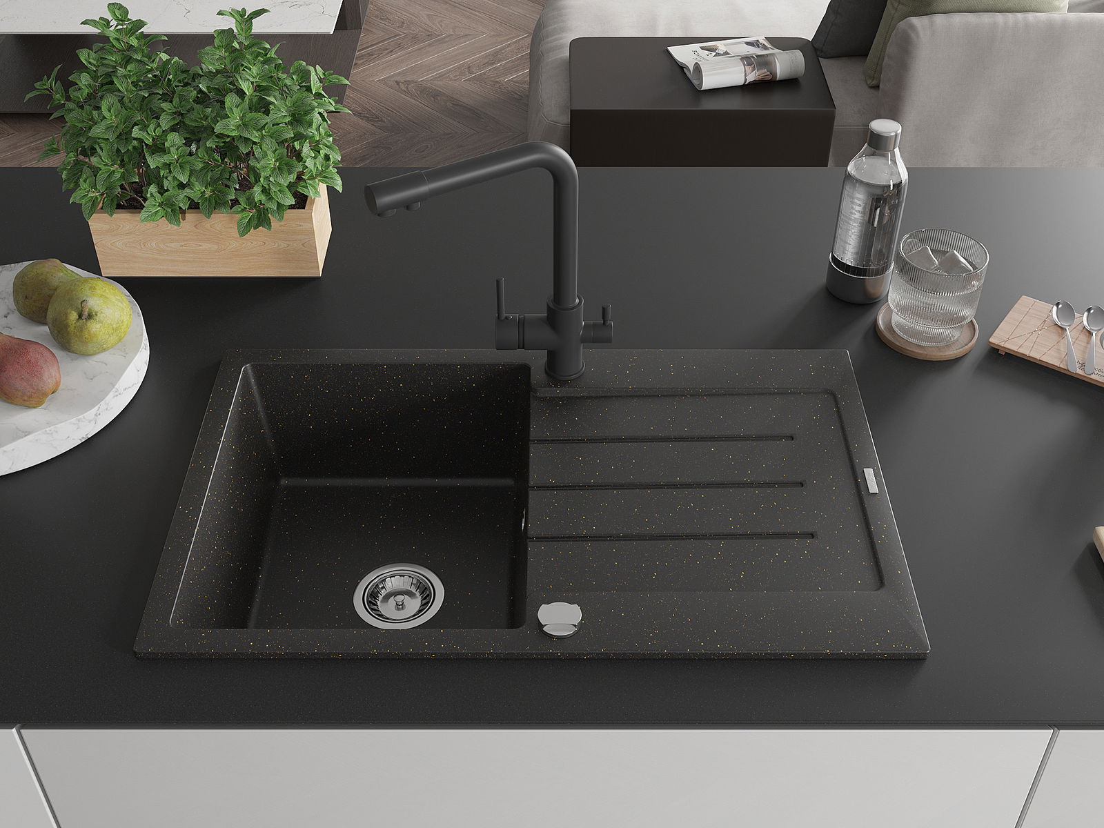 Mexen Bruno Granit Spullsteen mat enger Kummer mat Drëpsween an Kichekran Duero, schwaarz/gëllen metallesch