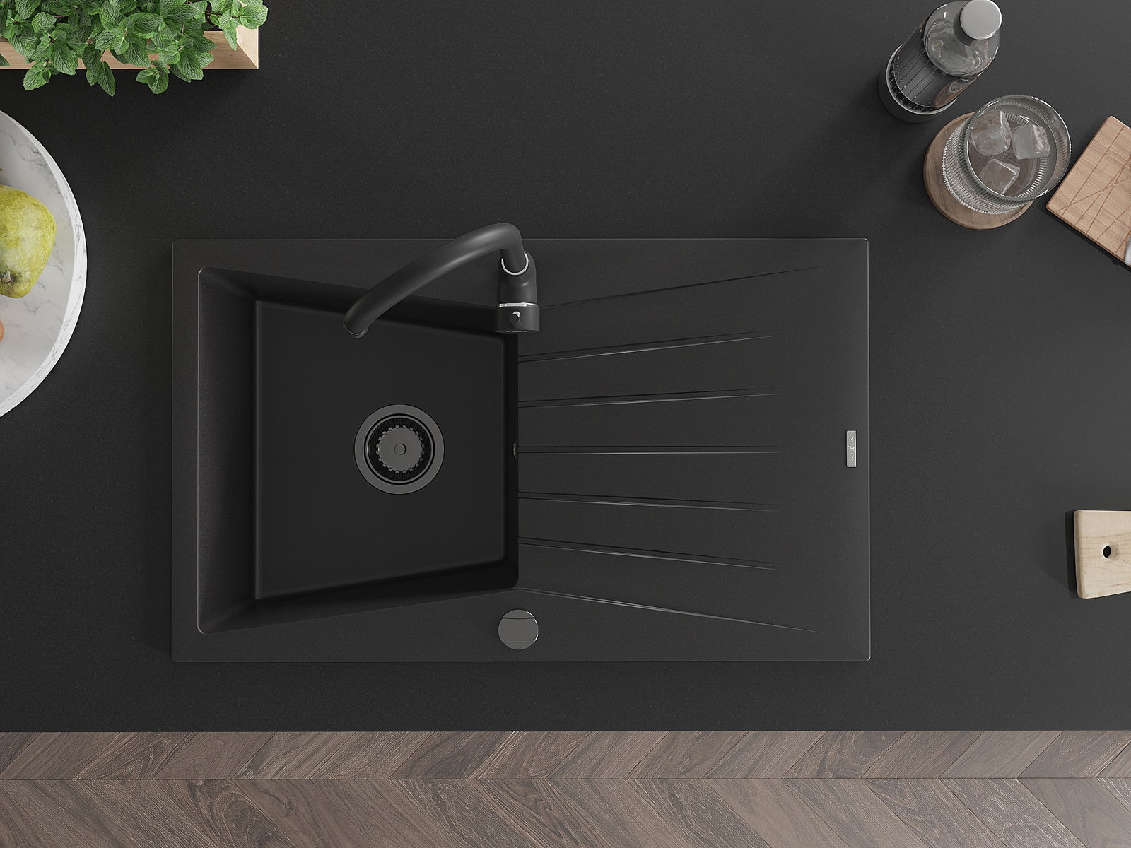 Mexen Cesar Granitiséier 1-Kummer-Spull mat Oflaaf a Kichekran Telma, schwaarz - 6514-77-670200-70-B