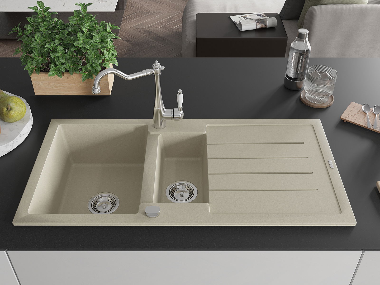 Mexen Andres Granit-Spullsteen 1,5-Kummer mat Dropfläch an Kichenkran Carla, béisch - 6515-69-670700-00