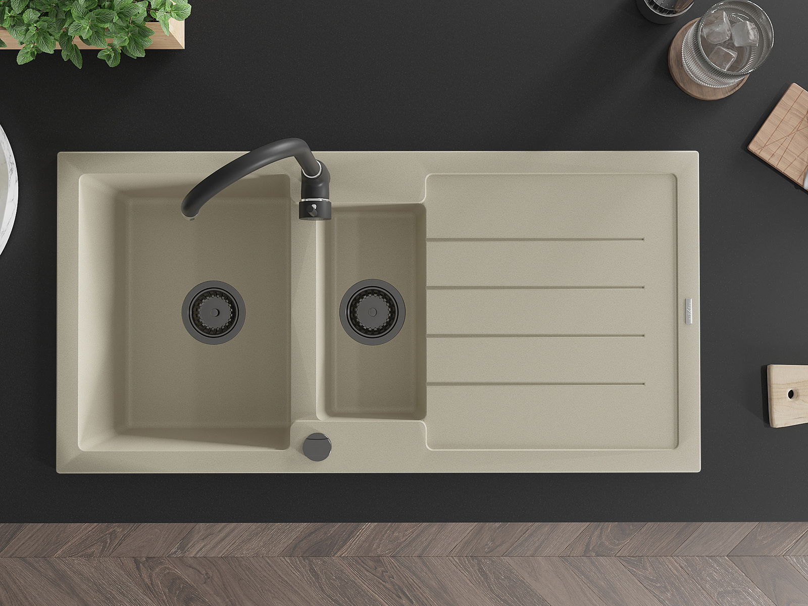 Den Ëmwäschbecken ass aus héichwäertege Granit gemaach. Et stellt eng elegant awer virun allem praktesch Ergänzung fir all Kichen duer, onofhängeg vun hirem Stil. Déi héich Qualitéit an Haltbarkeet vum Granit suergen fir méi järelaang Benotzung.