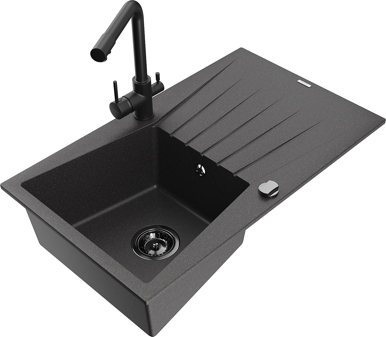 Mexen Cesar 1-Komponenten Granit-Évier mat Oflaaf an Kichenkran Duero, gesprengt schwaarz - 6514-76-671600-70-B