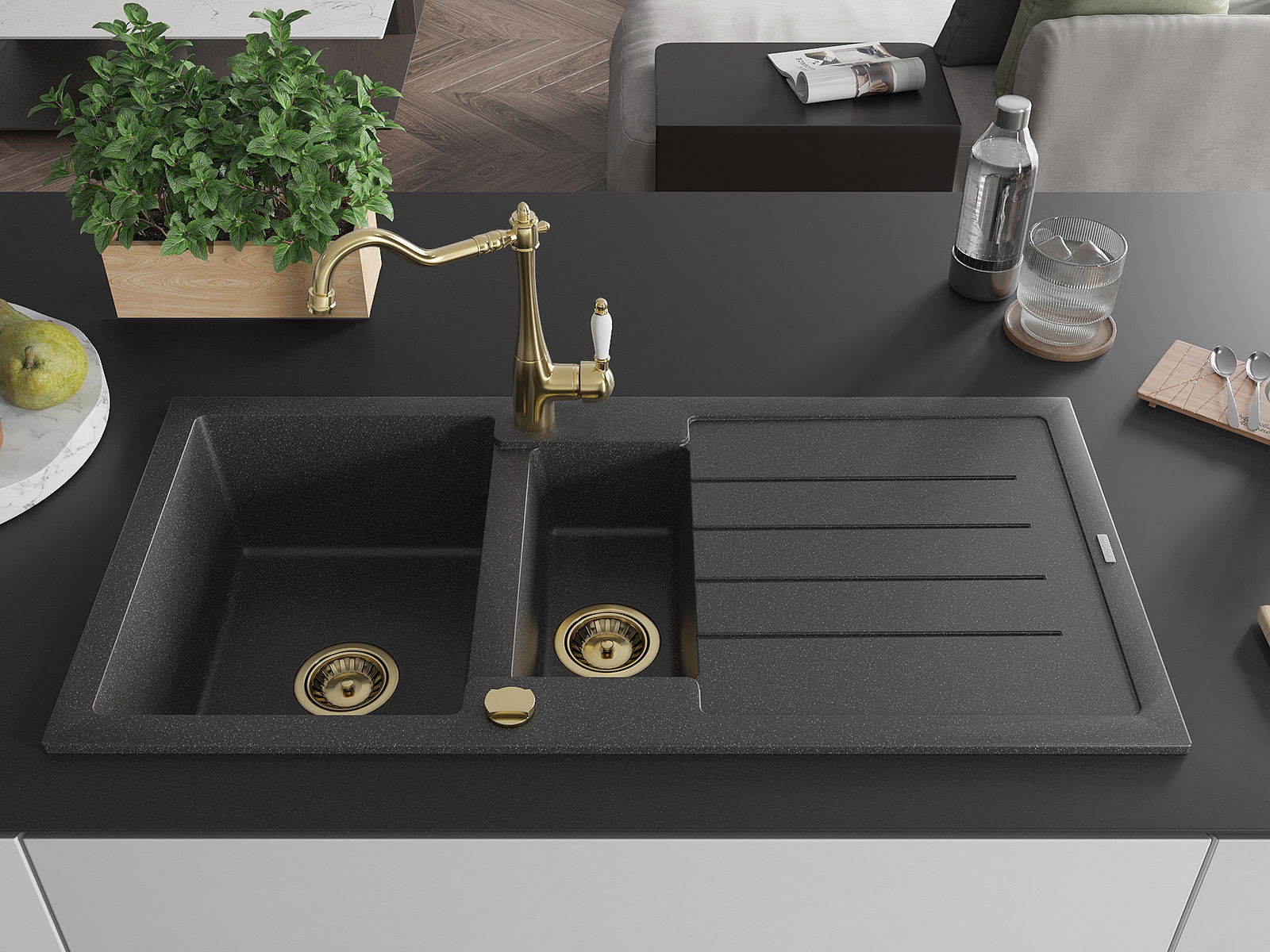 Den Spullsteen huet 2 virberäitet Lächer mat engem Duerchmiesser vun 35 mm, déi selbststänneg ausgeschloen kënne ginn. Se kënne fir d'Montage vun engem Flëssegkeetsspender benotzt ginn, deen d'Präsenz vu Plastikfläschen an der Kichen eliminéiert an hir en elegant Finish gëtt.