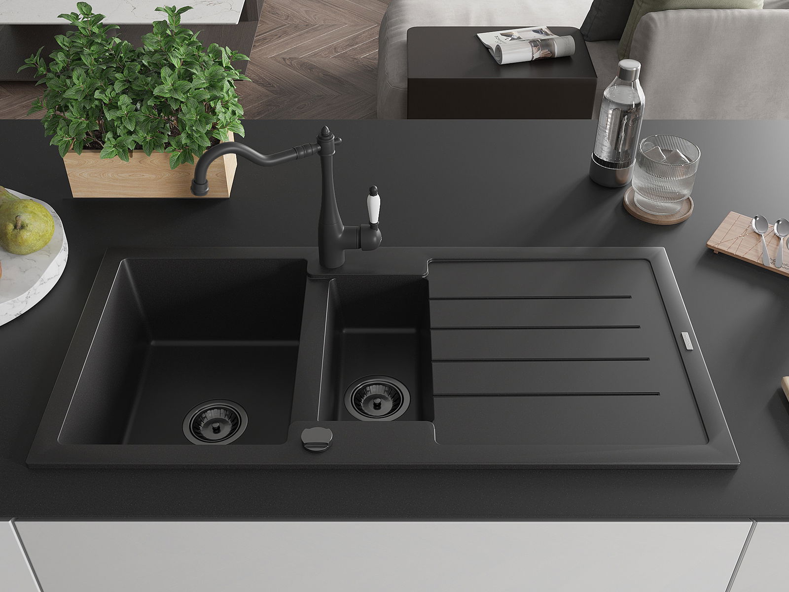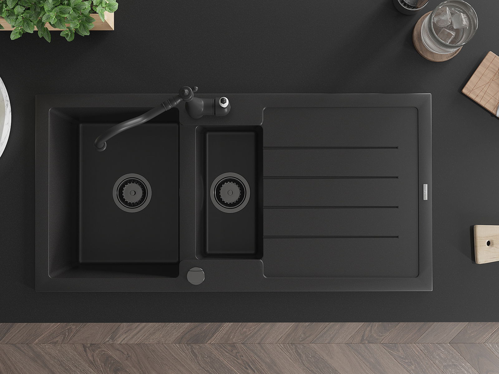 Mexen Andres Granit-Spullsteen 1,5-Kompartimenter mat Drainage an Kichenkrunn Carla, schwaarz - 6515-77-670700-70-B