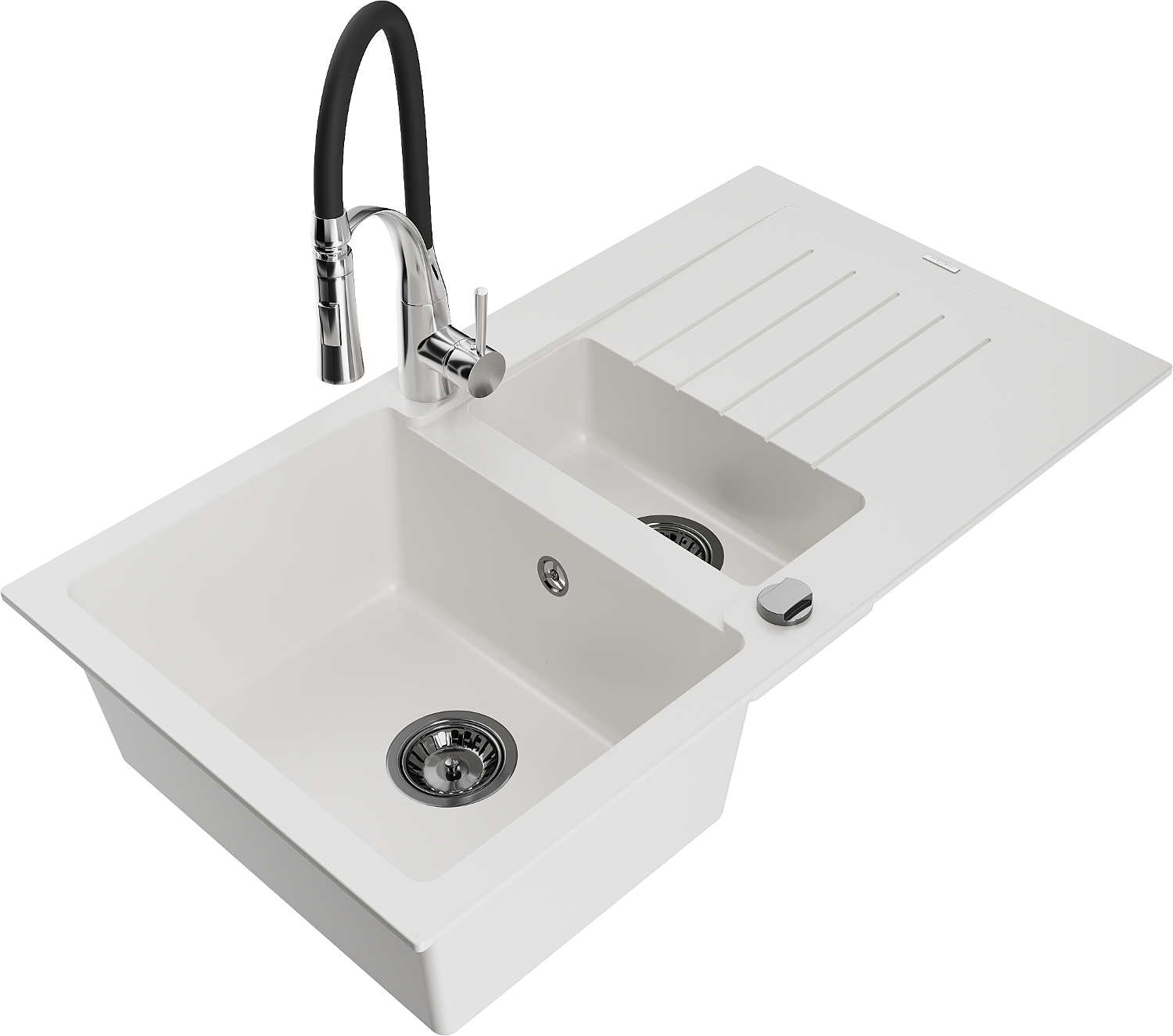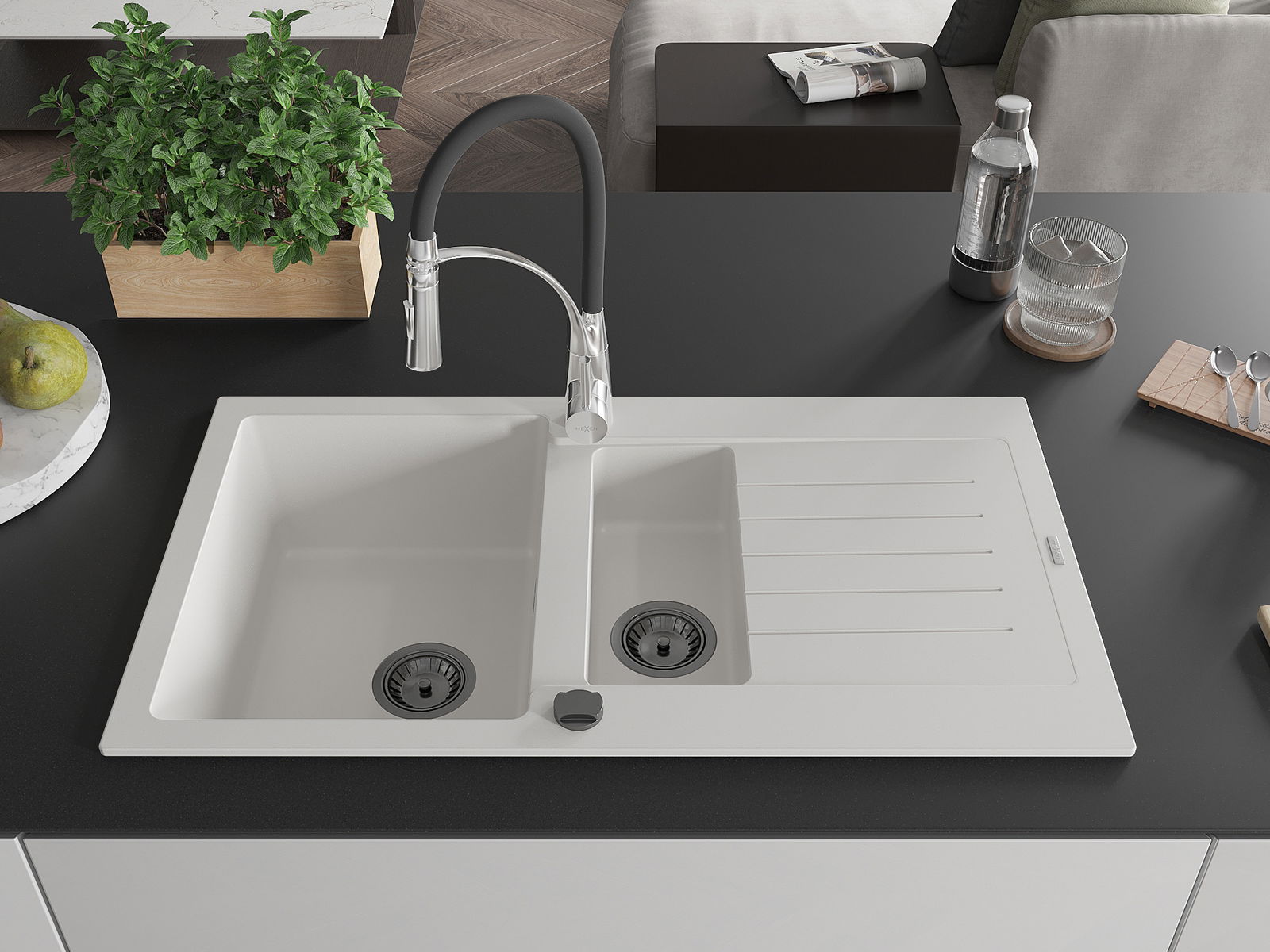 Den Spullsteen huet 2 virberäitet Lächer mat engem Duerchmiesser vun 35 mm, déi selbststänneg ausgeschloen kënne ginn. Se kënne fir d'Montage vun engem Flëssegkeetsspender benotzt ginn, deen d'Präsenz vu Plastikfläschen an der Kichen eliminéiert an hir en elegant Finish gëtt.