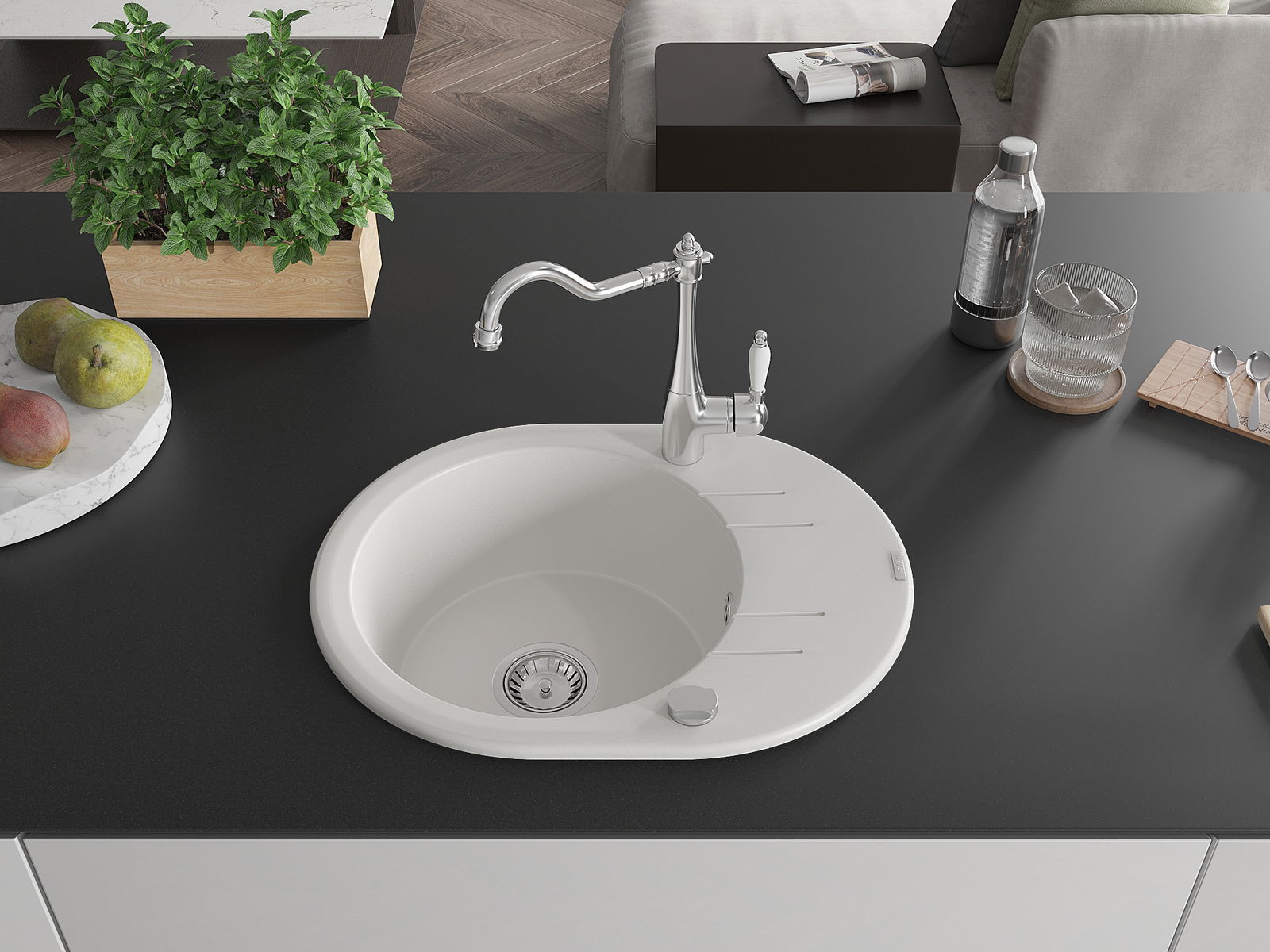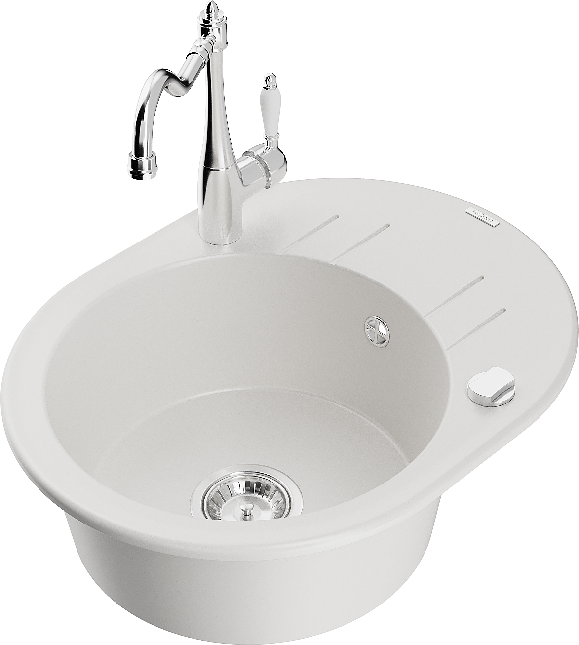 Mexen Kevin Granit-Spullsteen 1-Kummer mat Ofdrëpsfläche a Kichendëppe Carla, wäiss - 6517-20-670700-00