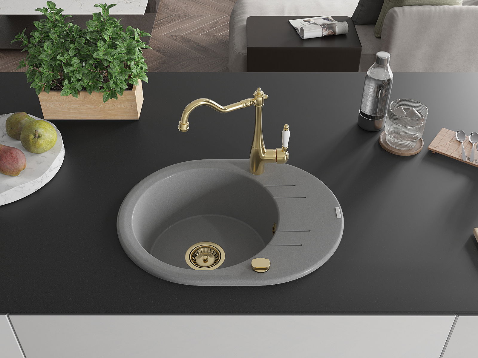 Den Ëmwäschbecken ass aus héichwäertege Granit gemaach. Et stellt eng elegant awer virun allem praktesch Ergänzung fir all Kichen duer, onofhängeg vun hirem Stil. Déi héich Qualitéit an Haltbarkeet vum Granit suergen fir méi järelaang Benotzung.