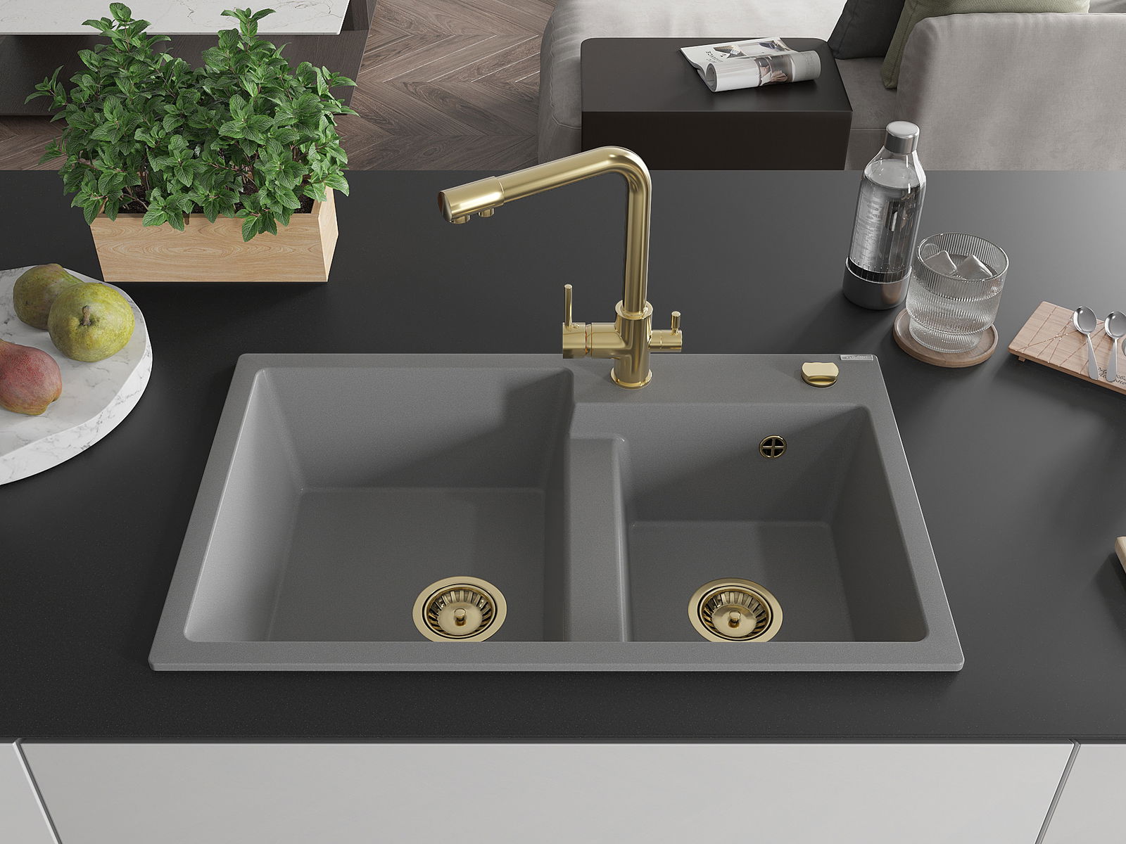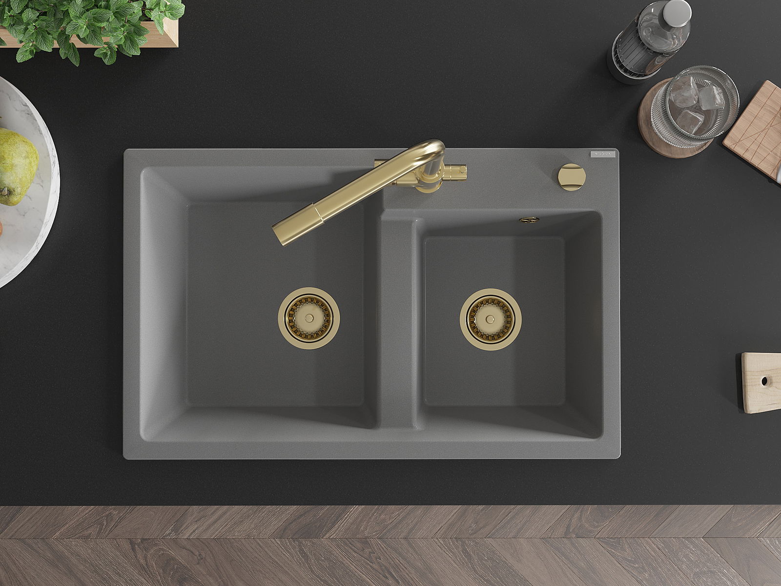 Mexen Tomas granit Ëvier mat a 2 Kummeren mat Kichebatterie Duero, gro - 6516-71-671600-50