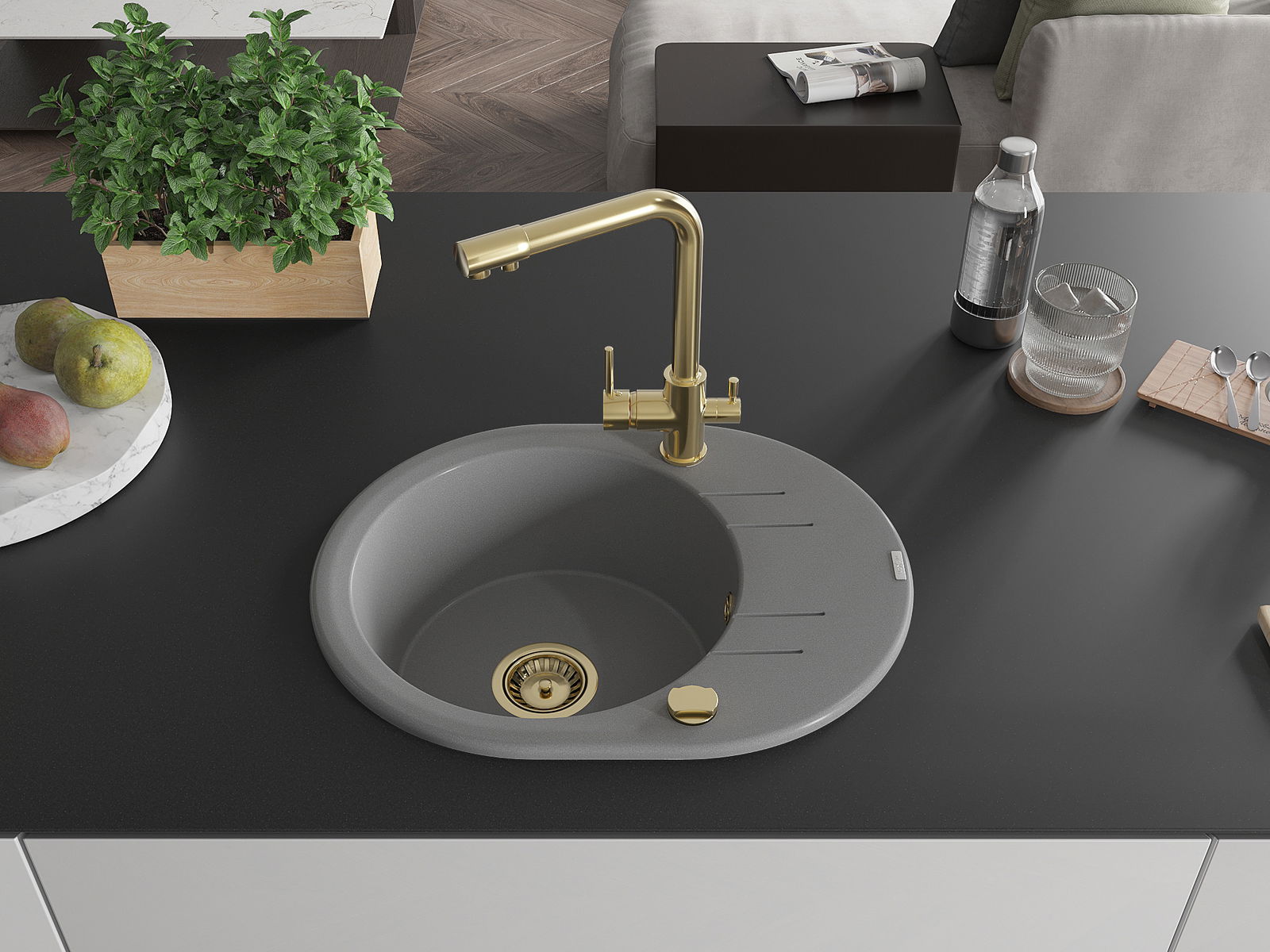 Den Ëmwäschbecken ass aus héichwäertege Granit gemaach. Et stellt eng elegant awer virun allem praktesch Ergänzung fir all Kichen duer, onofhängeg vun hirem Stil. Déi héich Qualitéit an Haltbarkeet vum Granit suergen fir méi järelaang Benotzung.