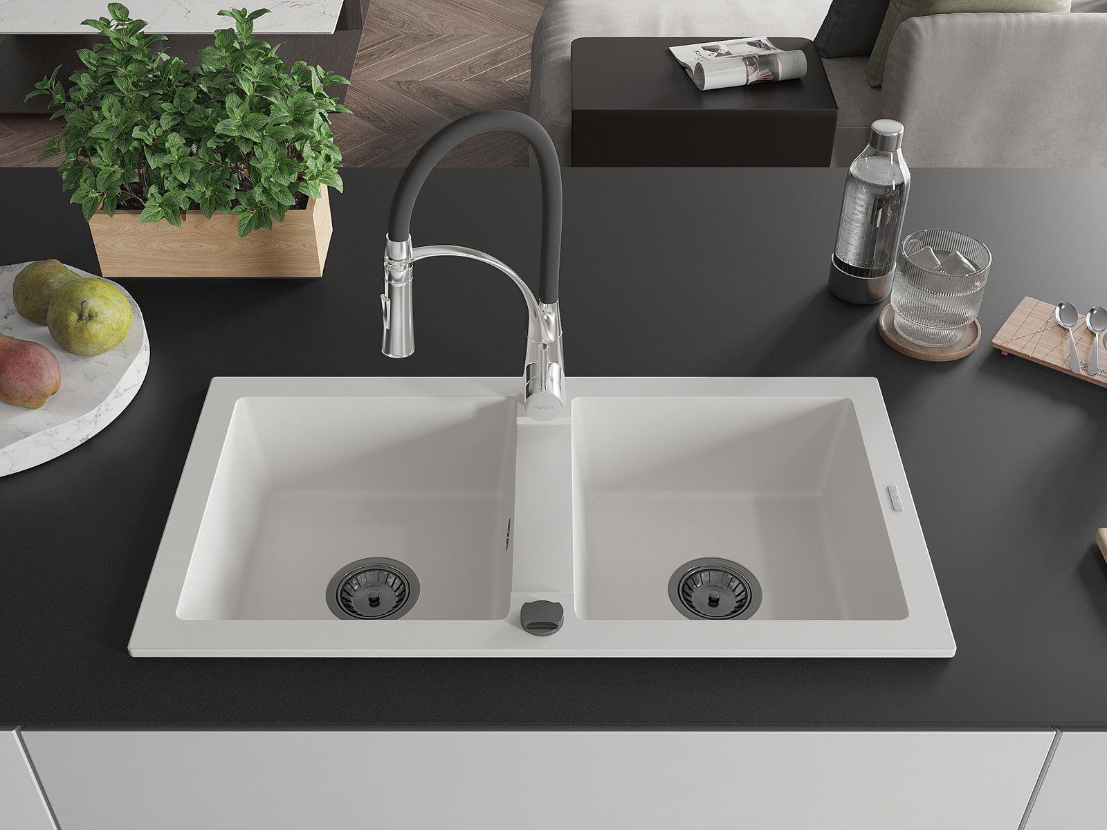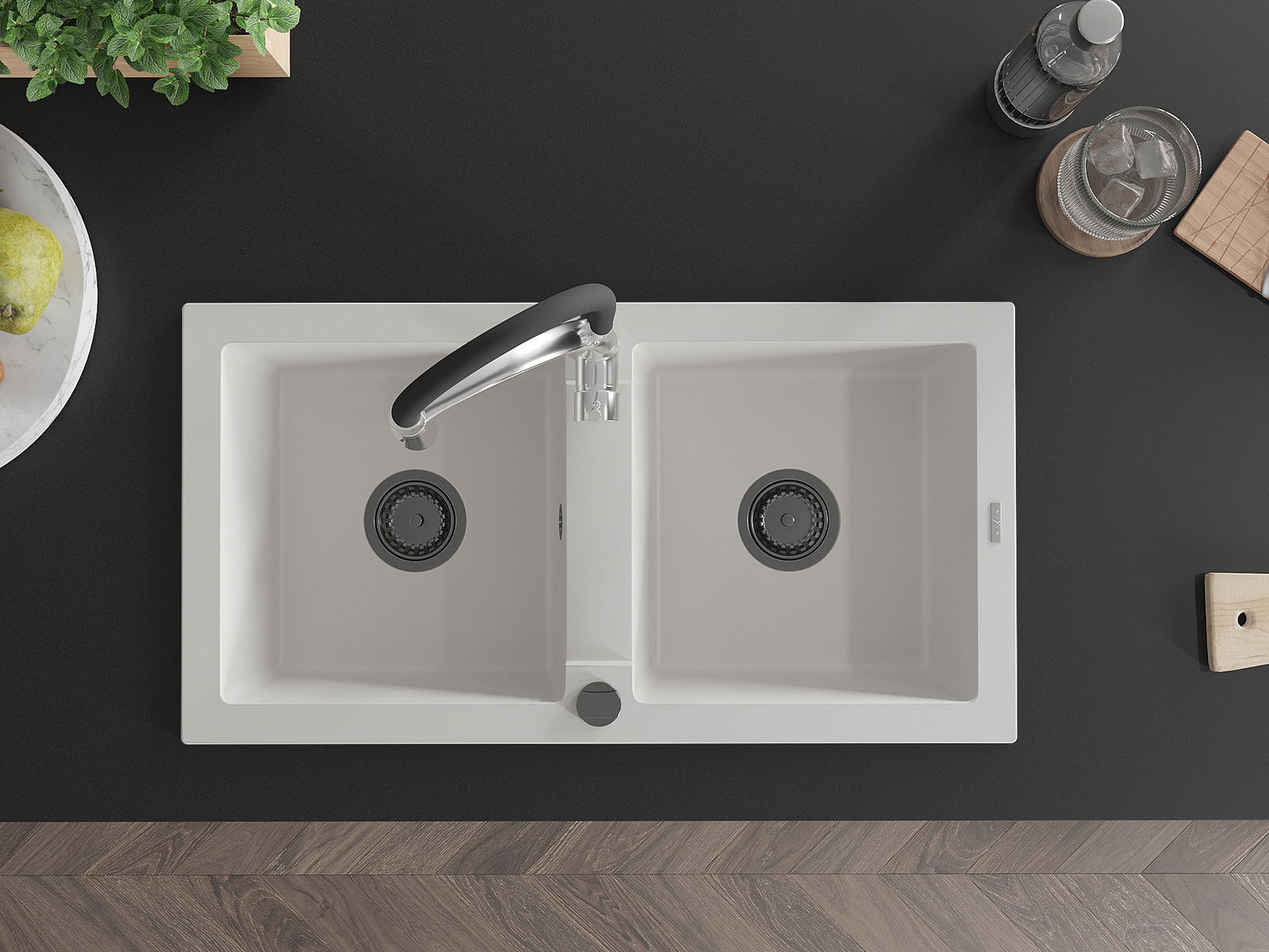 Mexen Mario Granit-Spullsteen mat 2 Kummer mat Kichenbatterie Aster, wäiss - 6504-20-73450-07-B