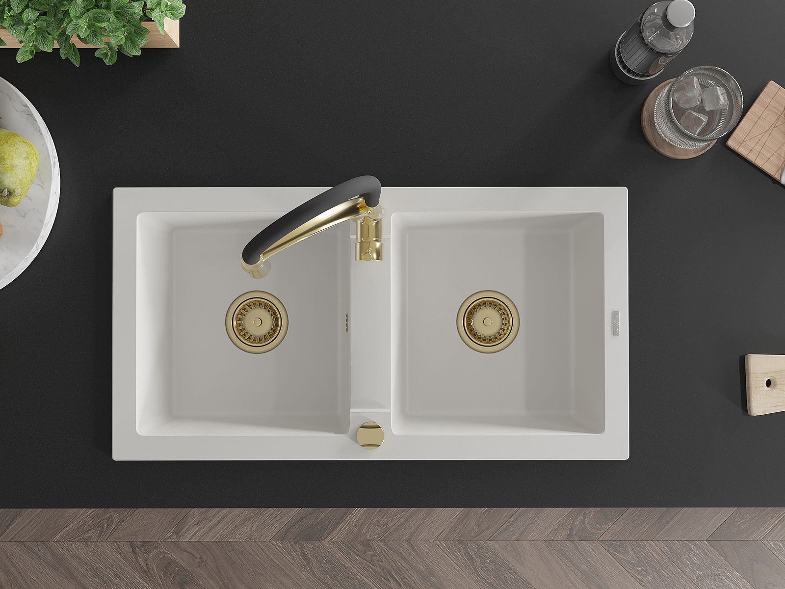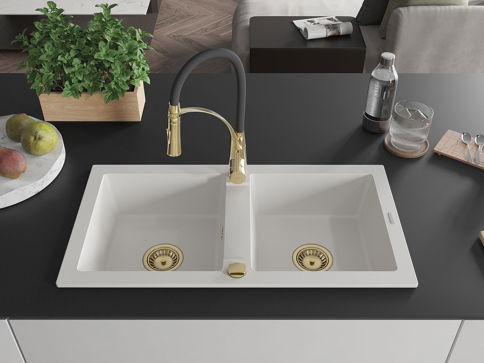 Mexen Mario Granit-Spullsteng mat 2 Schosselen an enger Kichekrunn Aster, wäiss - 6504-20-73450-57-G