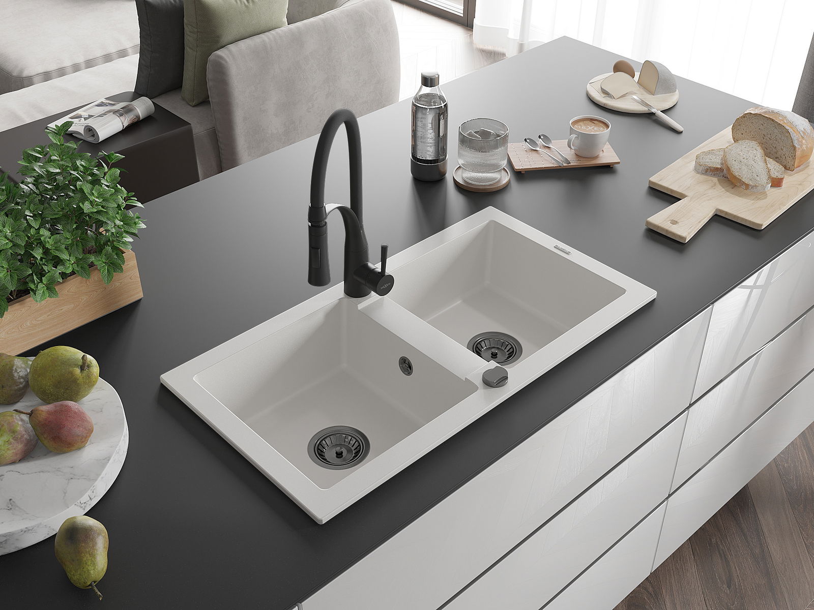 Mexen Mario Granit Spullsteen mat 2-Schanken mat Kichenkran Aster, wäiss - 6504-20-73450-70-B