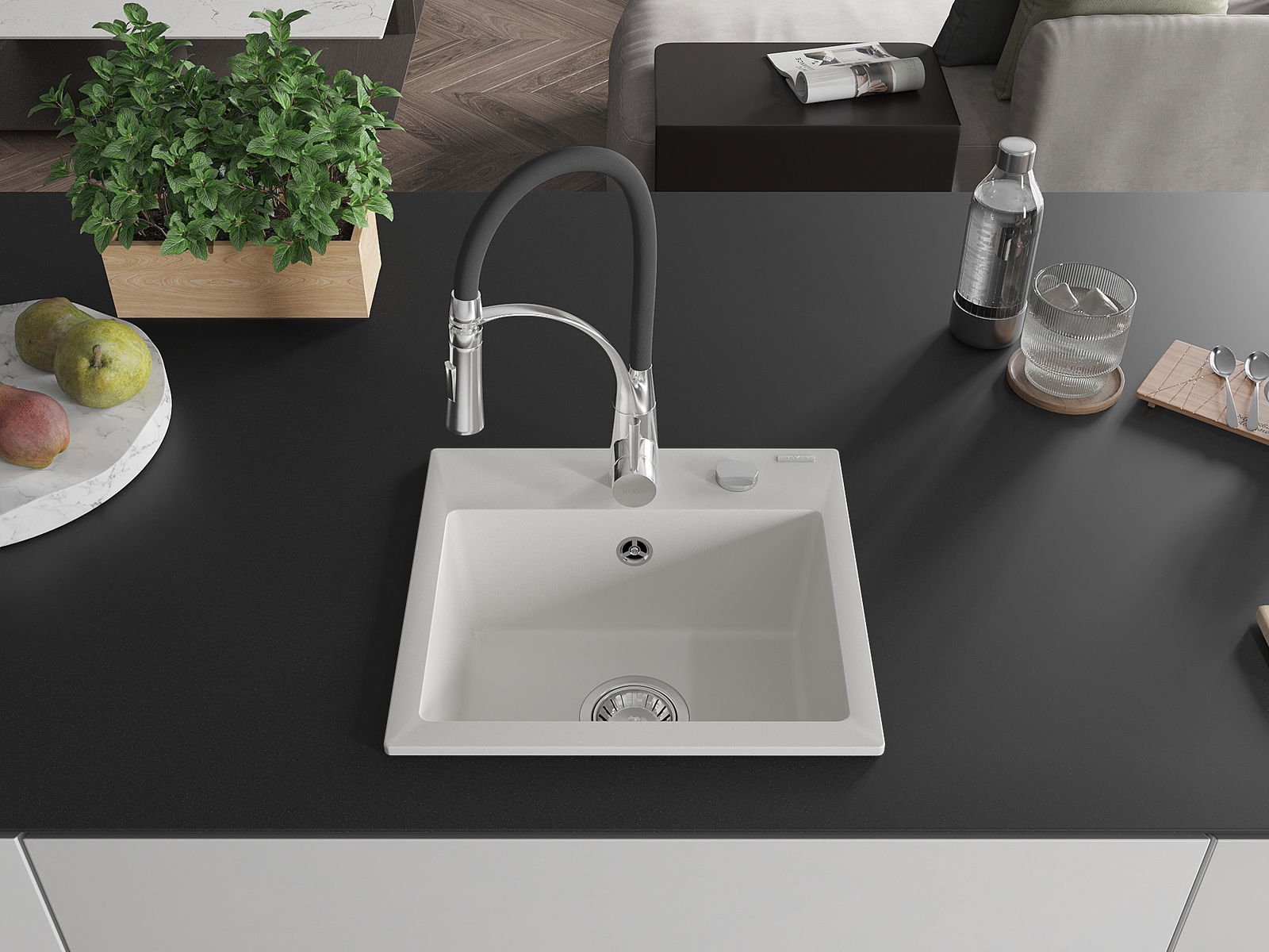 Den Ëmwäschbecken ass aus héichwäertege Granit gemaach. Et stellt eng elegant awer virun allem praktesch Ergänzung fir all Kichen duer, onofhängeg vun hirem Stil. Déi héich Qualitéit an Haltbarkeet vum Granit suergen fir méi järelaang Benotzung.