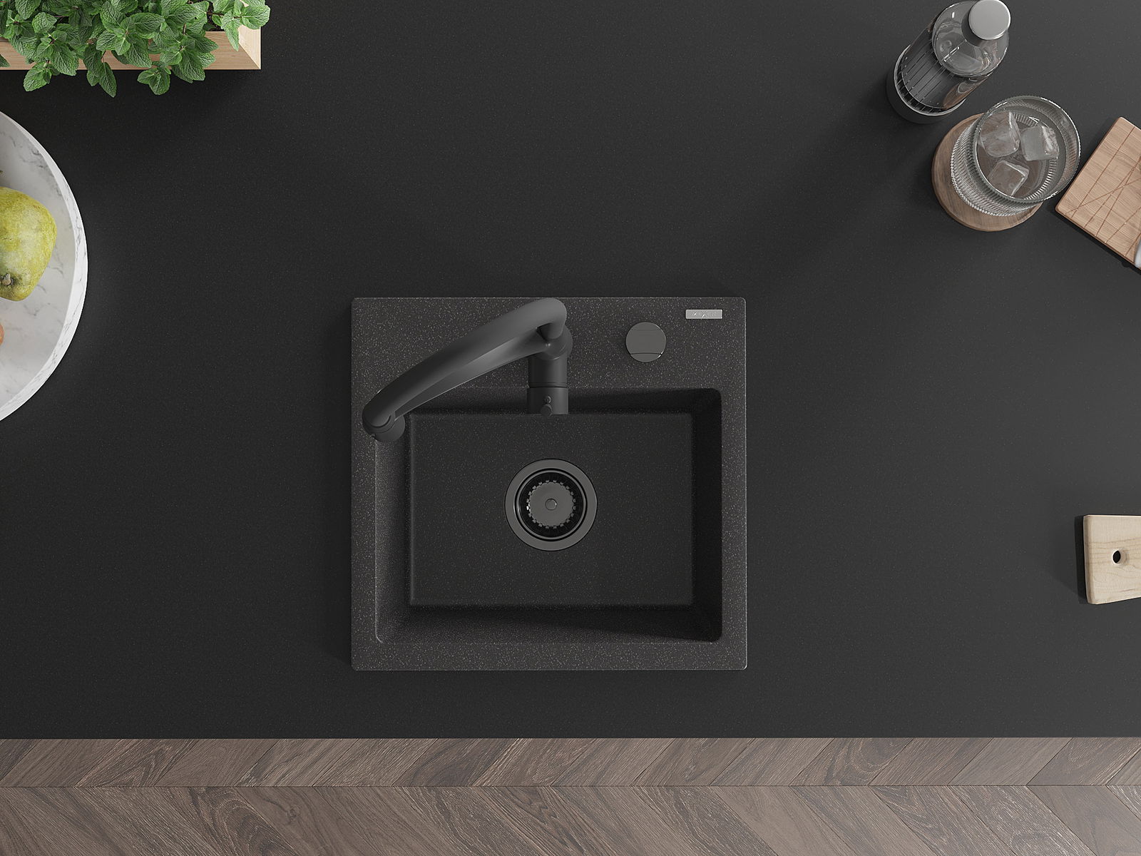 De Spullsteen huet e virgefraist Lach mat engem Duerchmiesser vu 35 mm fir selwer auszeschloen. Et kann ënner anerem genotzt ginn fir e Spender fir Flëssegkeet z'installéieren, deen d'Präsenz vu Plastikfläschen an der Kichen eliminéiert an hir en elegante Finish gëtt.