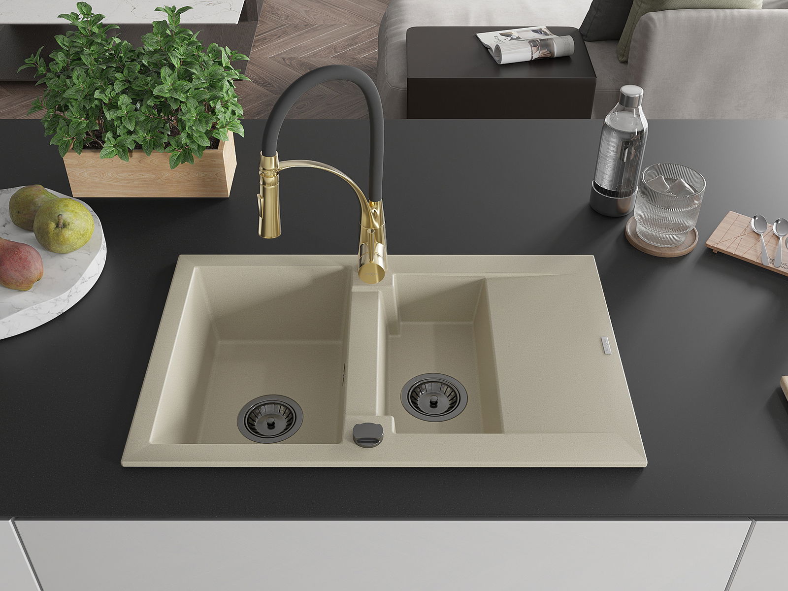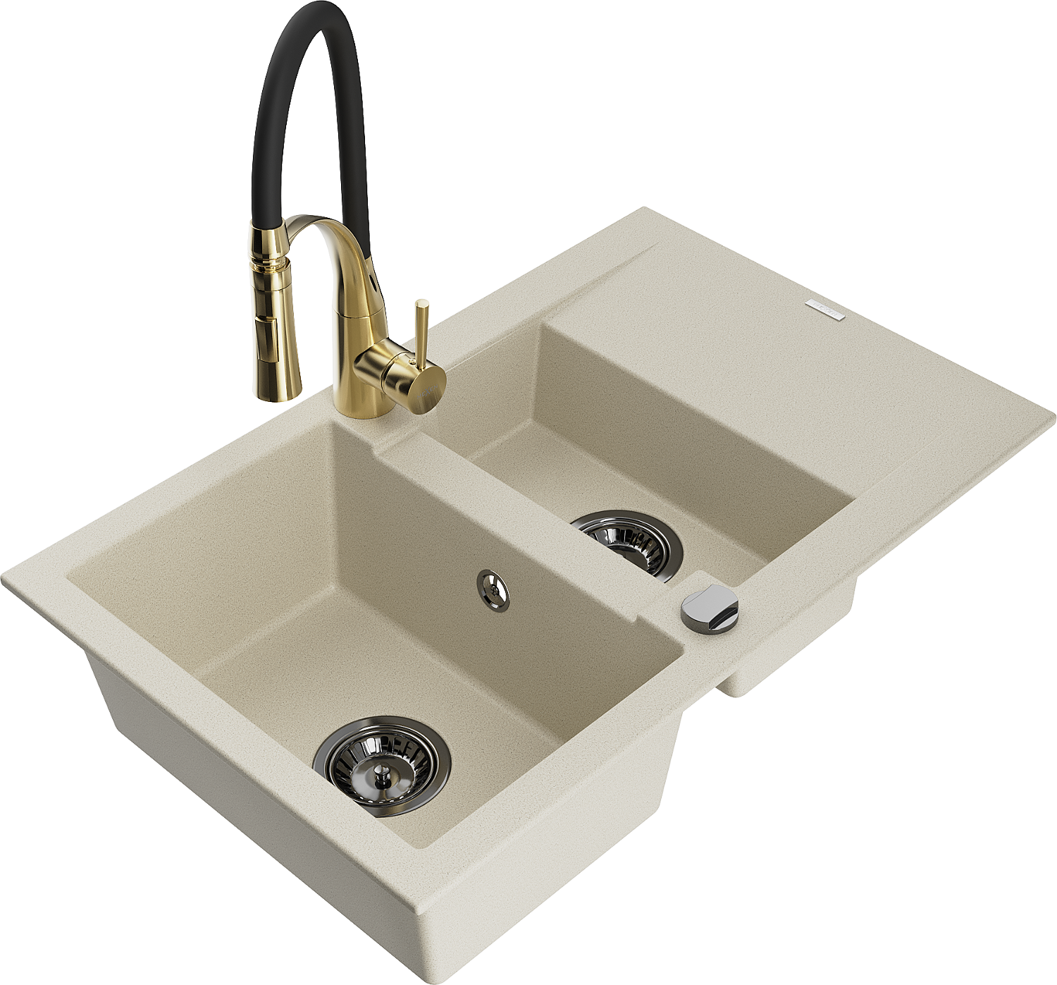 Mexen Gaspar Granitspullweimer mat 1,5-Komore mat Drëppdréier an Kücheskran Aster, béisch - 6507-69-73450-57-B