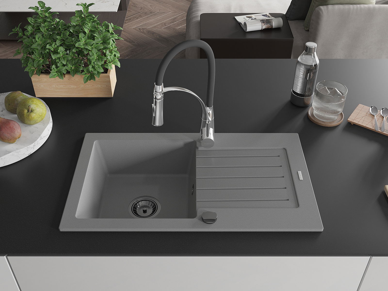Den Ëmwäschbecken ass aus héichwäertege Granit gemaach. Et stellt eng elegant awer virun allem praktesch Ergänzung fir all Kichen duer, onofhängeg vun hirem Stil. Déi héich Qualitéit an Haltbarkeet vum Granit suergen fir méi järelaang Benotzung.