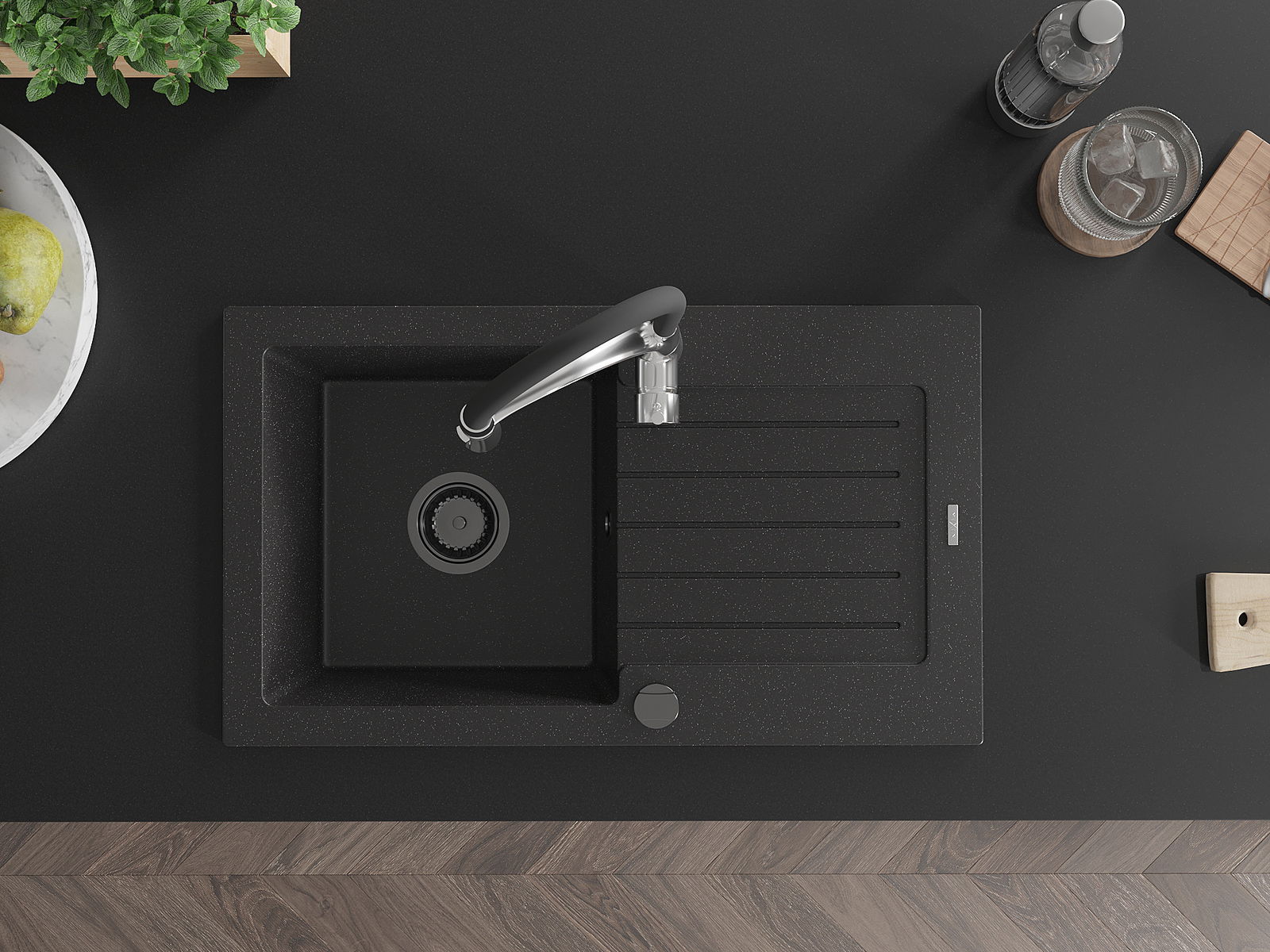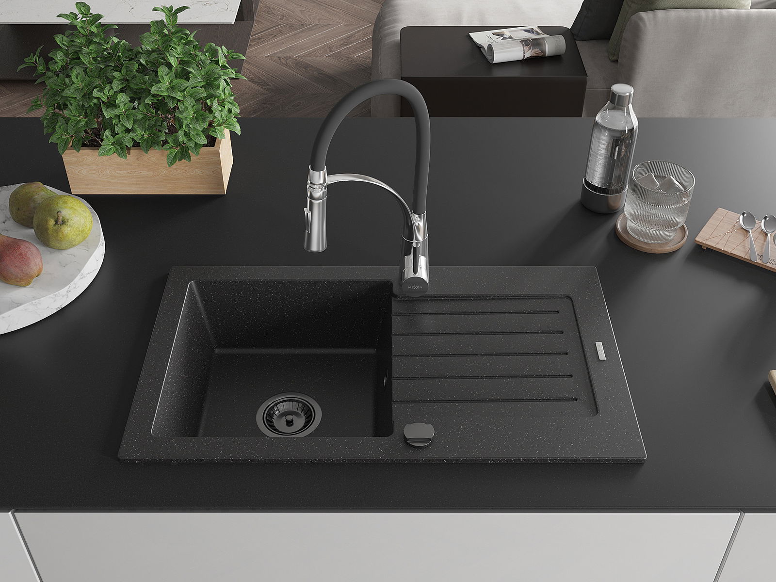 Mexen Pablo Granitspull- aarbechtsbänk mat 1 Schaf an Ofdréchpanneau an der Kichebatterie Aster, schwaarz/sëlwermetallic
