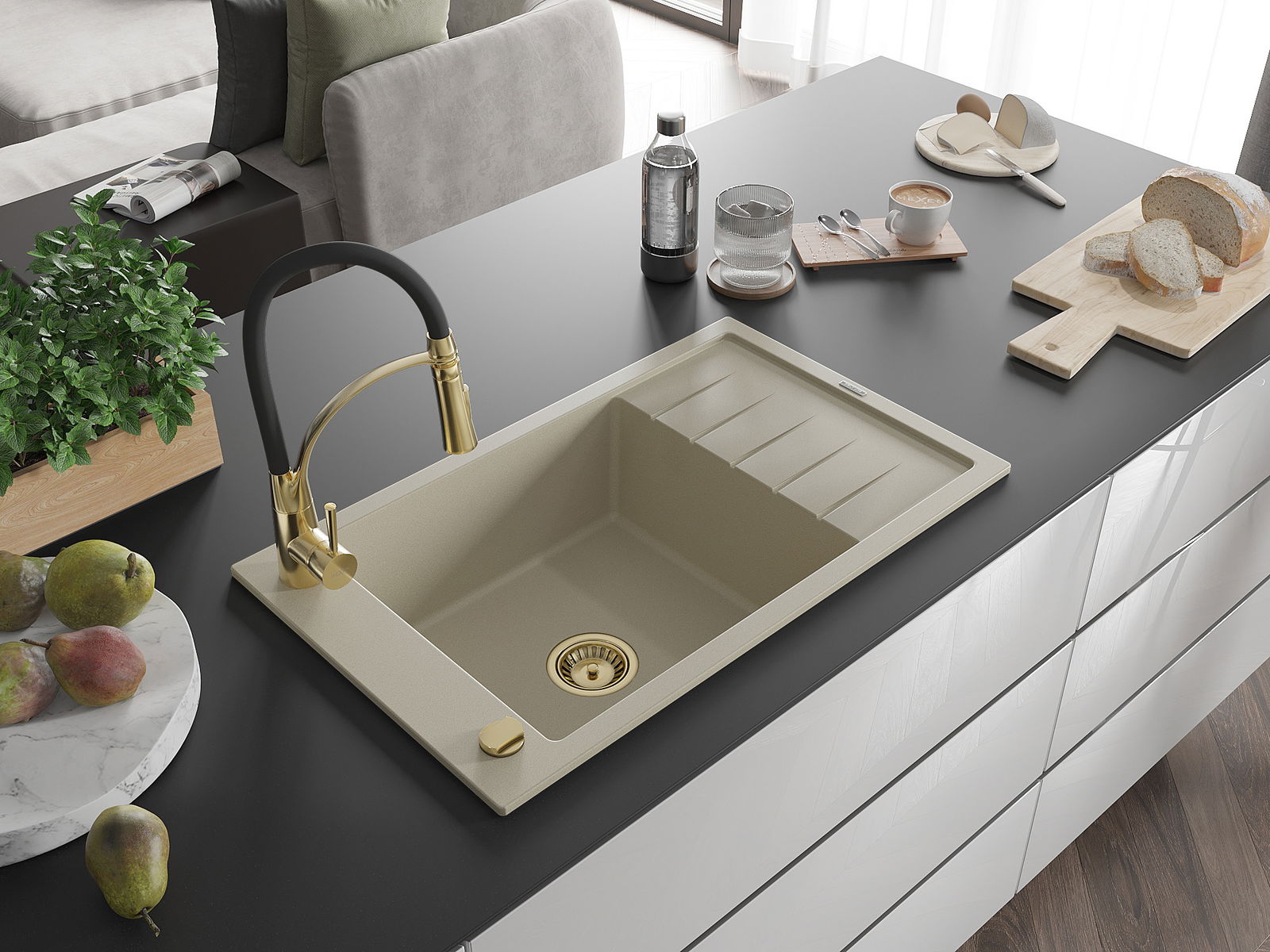 De Spullsteen huet e virgefraist Lach mat engem Duerchmiesser vu 35 mm fir selwer auszeschloen. Et kann ënner anerem genotzt ginn fir e Spender fir Flëssegkeet z'installéieren, deen d'Präsenz vu Plastikfläschen an der Kichen eliminéiert an hir en elegante Finish gëtt.
