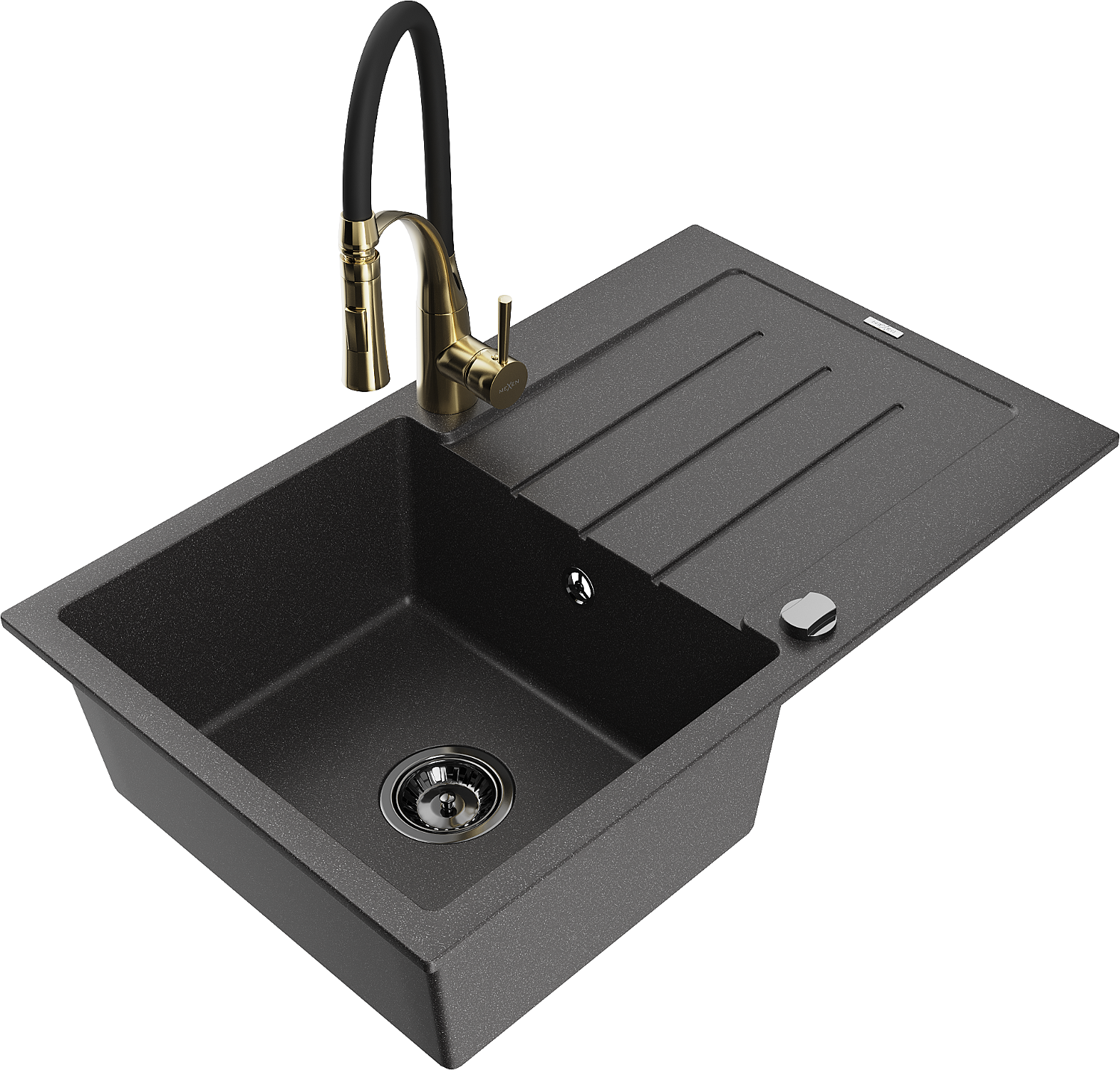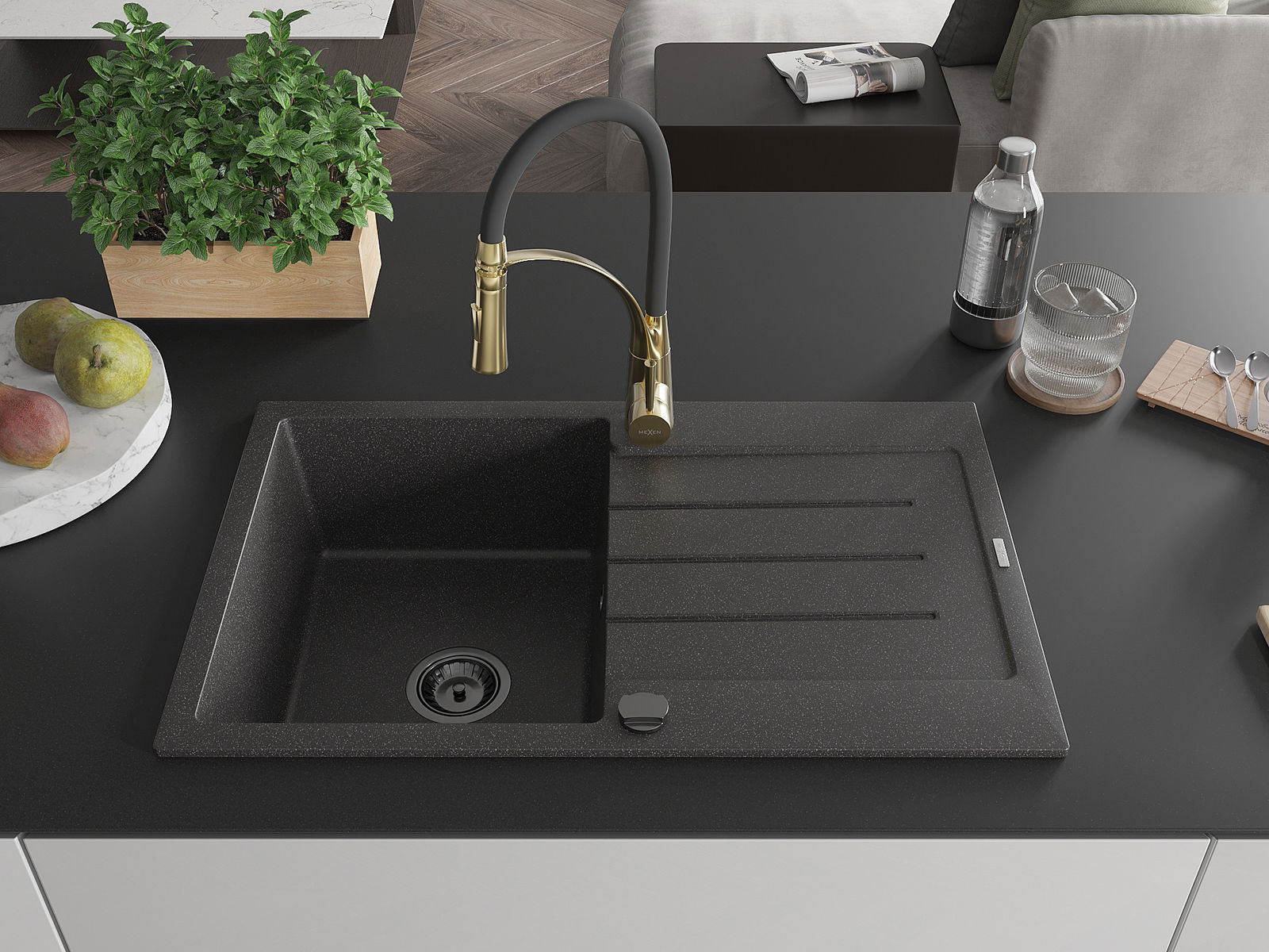 Mexen Bruno Granit-Spullsteen mat enger Schoss a Kichenbatterie Aster, schwarz gesprenkelt - 6513-76-73450-57-B