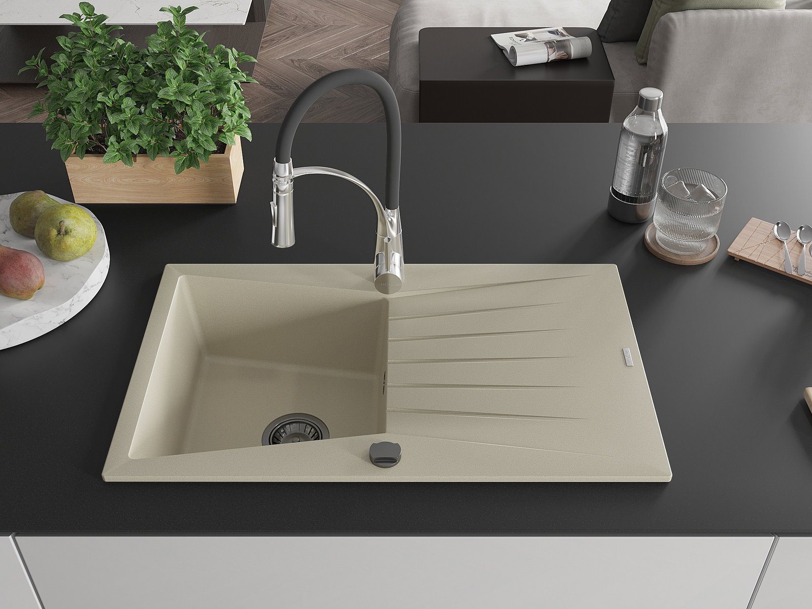 D'Uewerfläch vum Spullstee ass fleck- a verfärbungsresistent, wat se einfach ze botzen mécht an hir Faarf iwwer eng laang Zäit vum Gebrauch behalen léisst. Esthetesch an praktesch Ergänzung fir all Kichen.