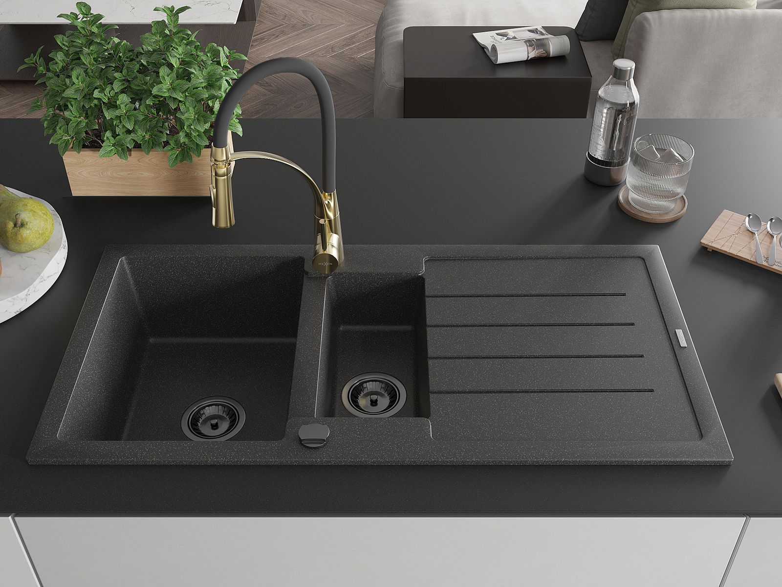 Den Spullsteen huet 2 virberäitet Lächer mat engem Duerchmiesser vun 35 mm, déi selbststänneg ausgeschloen kënne ginn. Se kënne fir d'Montage vun engem Flëssegkeetsspender benotzt ginn, deen d'Präsenz vu Plastikfläschen an der Kichen eliminéiert an hir en elegant Finish gëtt.